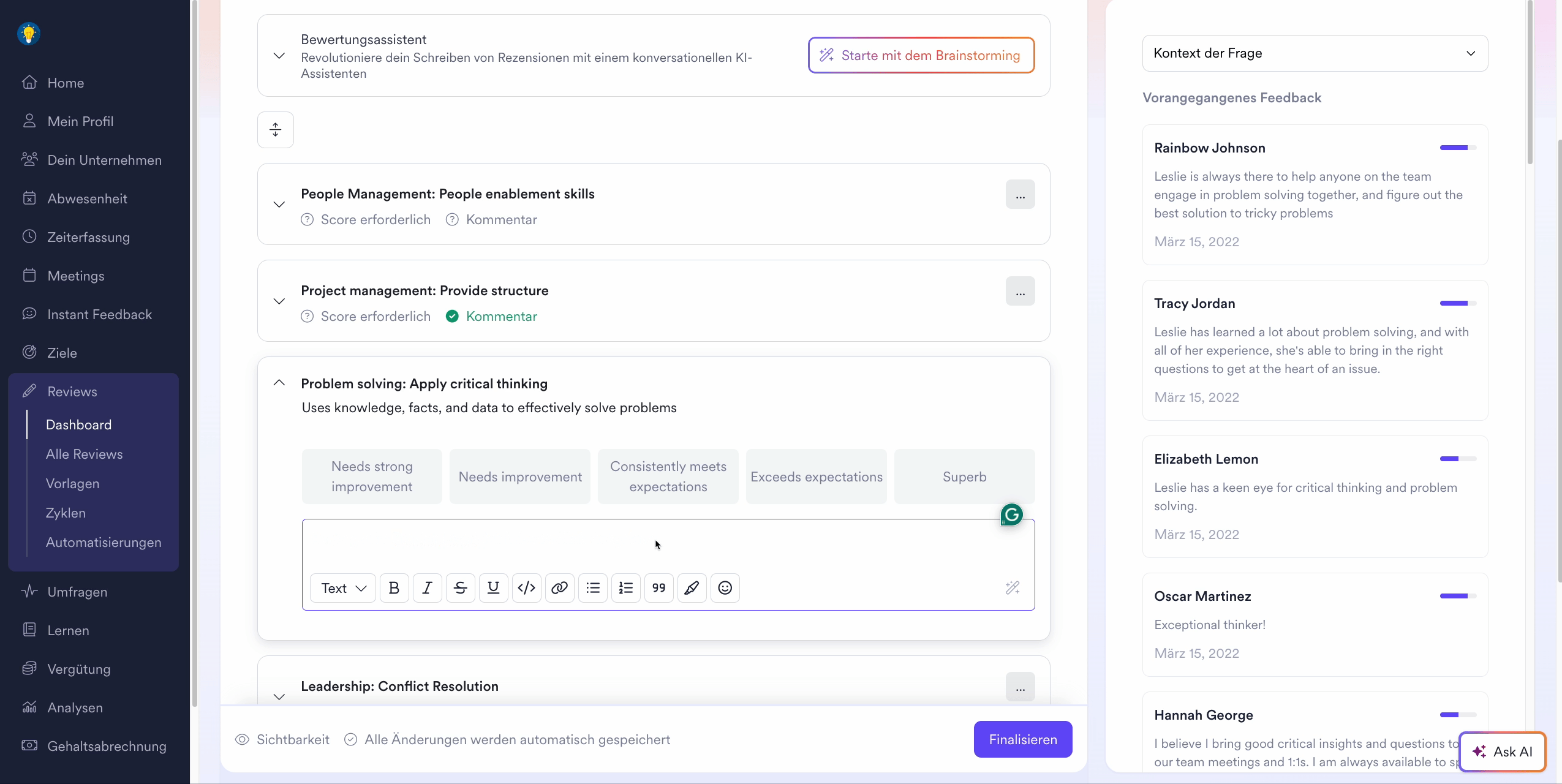 Die Leapsome AI bietet Führungskräften eine einfache Möglichkeit, ihre Gedanken in konstruktive Kommentare umzuwandeln, die mit Ideen für Verbesserungsinitiativen angereichert sind und den Teammitgliedern wirkungsvollere Erkenntnisse geben.