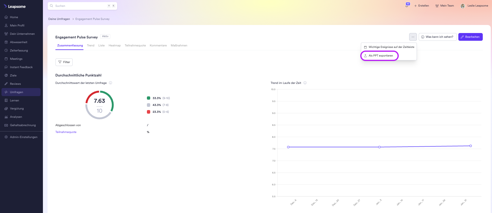 Es gibt Situationen, in denen du Survey-Ergebnisse Stakeholdern außerhalb der Plattform präsentieren musst, wie dem CEO, dem Vorstand oder bei unternehmensweiten Meetings. Der Survey-Export im PPT-Format ermöglicht es dir, relevante Analysen aus Survey-Ergebnissen in eine Präsentation zu ziehen, die einfach geteilt und präsentiert werden kann.