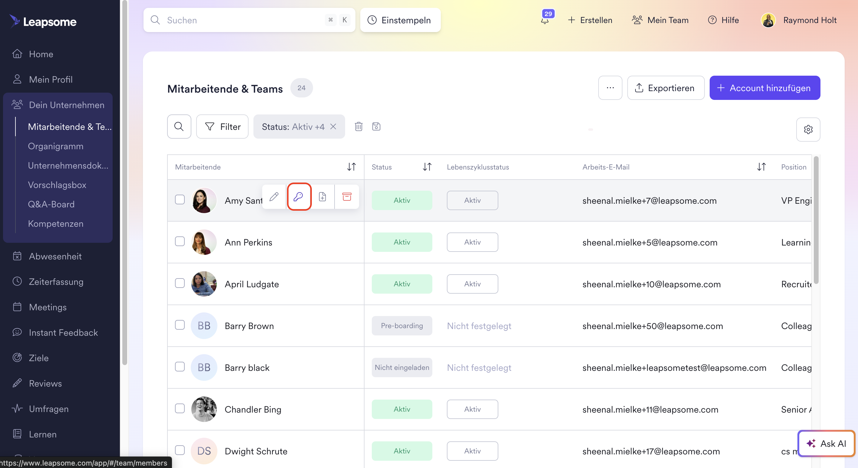 Super-Admins können während der Imitation nur den Inhalt ansehen, was bedeutet, dass sie keine Aktionen im Namen der imitierten Mitarbeitenden ausführen können. Dieser Nur-Lesen-Modus stellt sicher, dass die Integrität der Daten und Einstellungen der Nutzenden intakt bleibt. Sie können flexibel Nutzende mit jedem Status (aktiv, eingeladen, Pre-Onboarding, deaktiviert) imitieren.