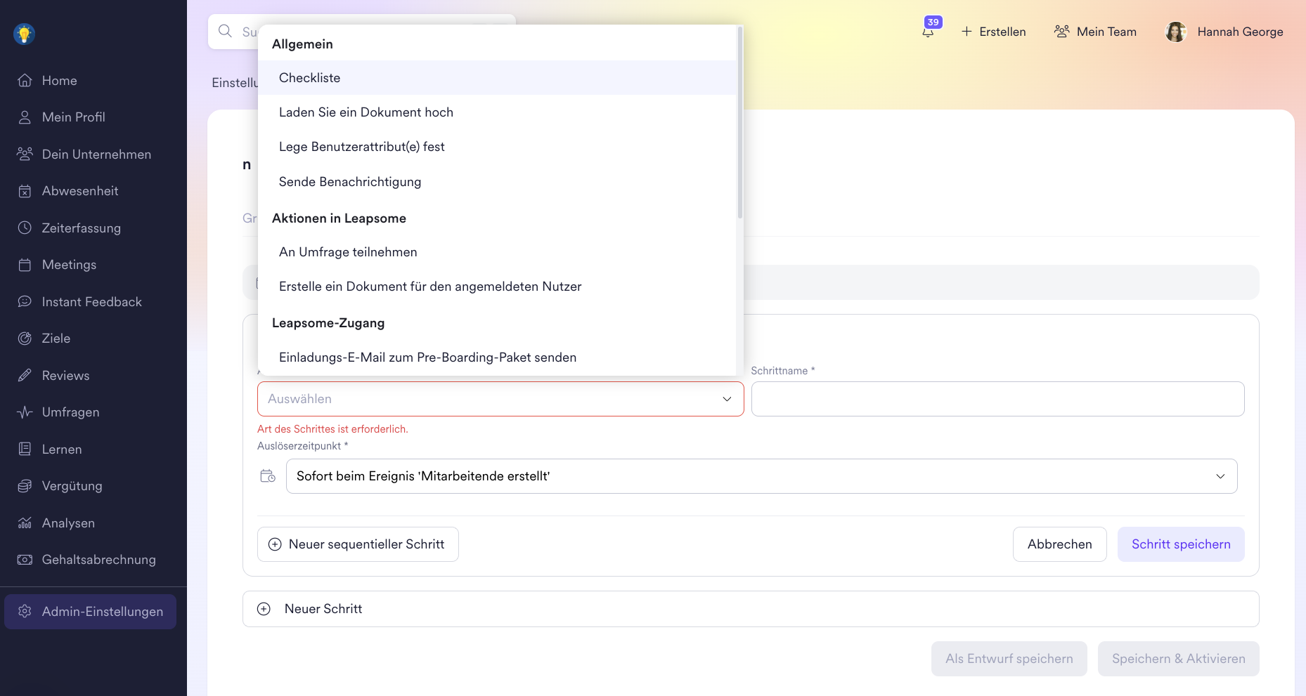 Leapsomes Workflow-Builder ermöglicht es dir, viele Aktionen zu automatisieren, wie zum Beispiel: