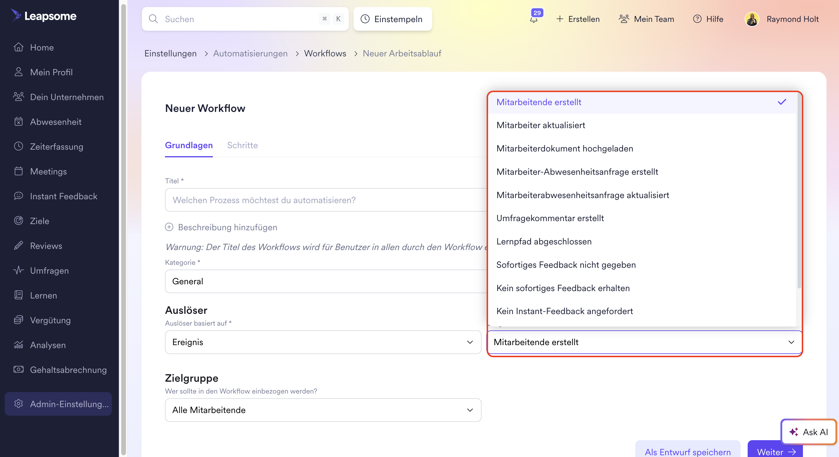 Wenn ein Workflow ausgelöst wird, werden die entsprechenden Aktionen ausgeführt, wie sie in der Workflow-Konfiguration definiert sind. Zum Beispiel können wir bei einem Workflow zur „Geburtstagsfeier“ Schritte hinzufügen, etwa: „Benachrichtigung senden“ und einen datumsbasierten Auslöser für den Geburtstag von Mitarbeitenden auswählen. Wenn das Leapsome-System einen bevorstehenden Geburtstag von Mitarbeitenden erkennt, wird es den bestehenden Workflow scannen und den festgelegten Richtlinien folgen. Abgeschlossene Workflow-Schritte werden unter den eingeschriebenen Nutzenden im Workflow aufgeführt, um ein Audit-Log zu verwalten.