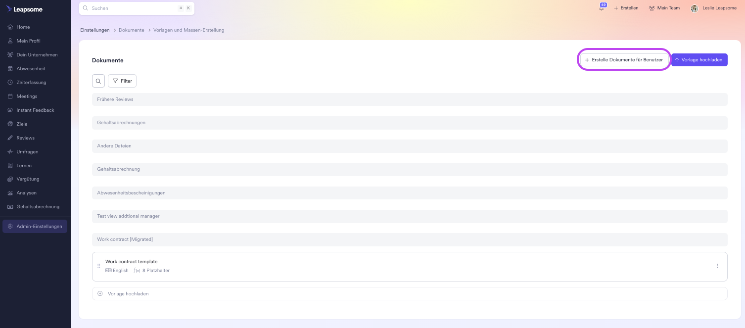 Sobald du eine Dokumentvorlage wie beschrieben hier erstellt hast, kannst du sie nutzen, um Dokumente für Mitarbeitende zu erstellen, die dann in ihrem Profil unter dem Reiter „Dokumente“ hinzugefügt werden. Du kannst ein neues Dokument erstellen, indem du zu „Einstellungen“ > „Dokumente“ > „Vorlagen und Massen-Erstellung“ > „Erstelle Dokumente für Benutzer“ navigierst.