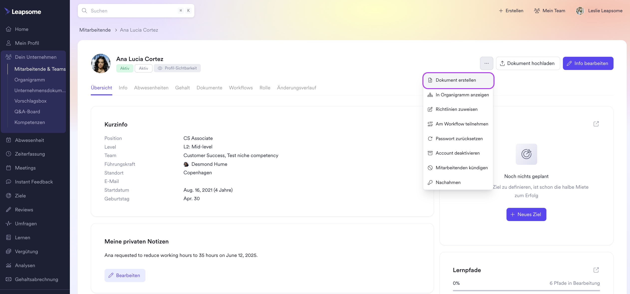 Du kannst auch direkt aus dem Profil eines Mitarbeitenden ein Dokument erstellen. Gehe dazu zum Profil der Person und klicke auf die drei vertikalen Punkte > „Dokument erstellen“. Alternativ kannst du, wenn du dich in der „Mitarbeitende & Teams“-Liste befindest und über eine Person schwebst, ebenfalls die Option finden, ein Dokument zu erstellen.