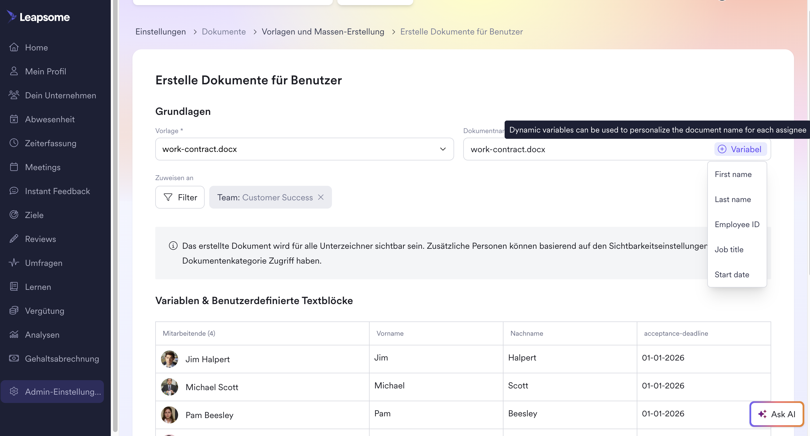 Wenn du beginnst, Mitarbeitende dem Dokument zuzuweisen, siehst du eine Vorschau aller für die zugewiesene Person relevanten Variablen im Bereich 'Variablen' unten. Sieh dir den Abschnitt 'Variablen für die Massen-Erstellung' an, um eine vollständige Liste der Systemvariablen zu erhalten. Dort findest du die Variablen im korrekten Format, das für die Vorlagenerstellung erforderlich ist. Zum Beispiel wird die Variable {{document-creation-date}}, wenn sie einer Vorlage hinzugefügt wird, automatisch das „heutige" Datum zum Zeitpunkt der Zuweisung des Dokuments an Nutzende einfügen, oder {{start-date}}, um die dynamischen Werte der zugewiesenen Person darzustellen. Vergiss nicht, auf 'Dokumente erstellen' zu klicken, wenn du bereit bist. Die Dokumentenverarbeitung kann einige Minuten dauern. Die zugewiesene(n) Person(en) werden nach Abschluss benachrichtigt.