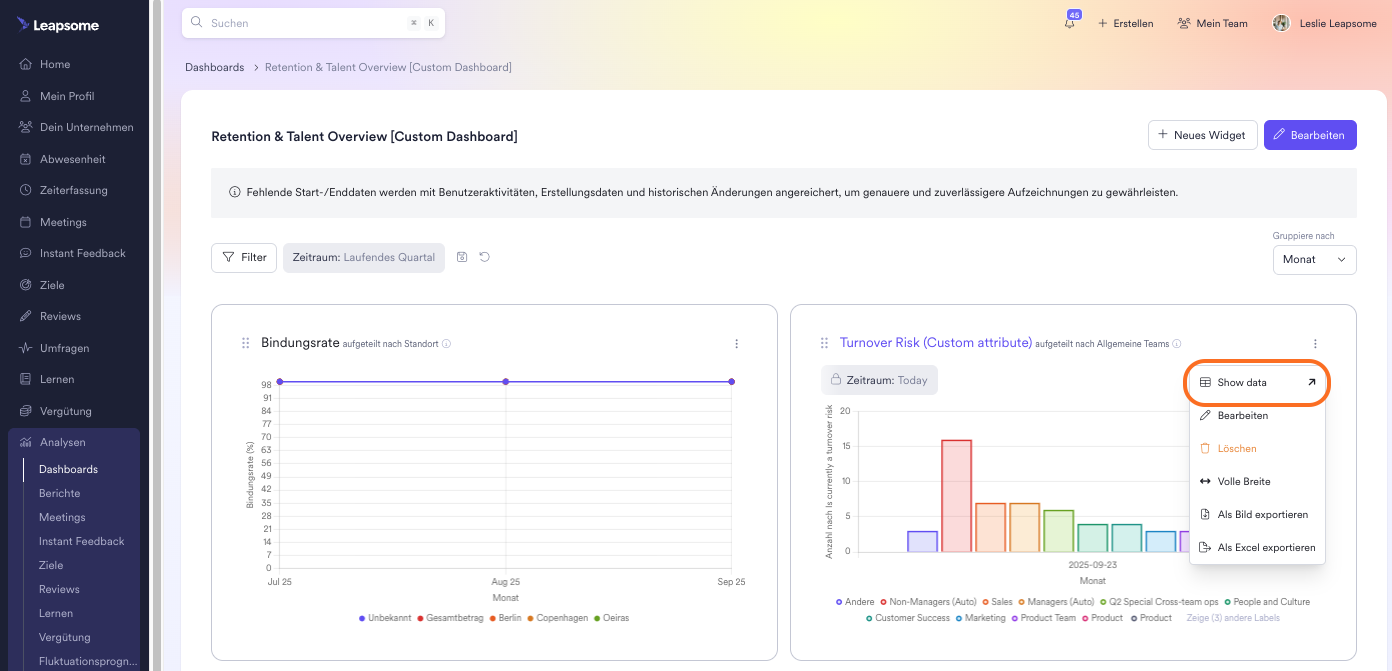 Analytics-Dashboard-Widgets ermöglichen es dir, die Mitarbeiterdaten hinter aggregierten Zahlen einzusehen. Um zu sehen, welche Mitarbeitende in einem Widget enthalten sind: