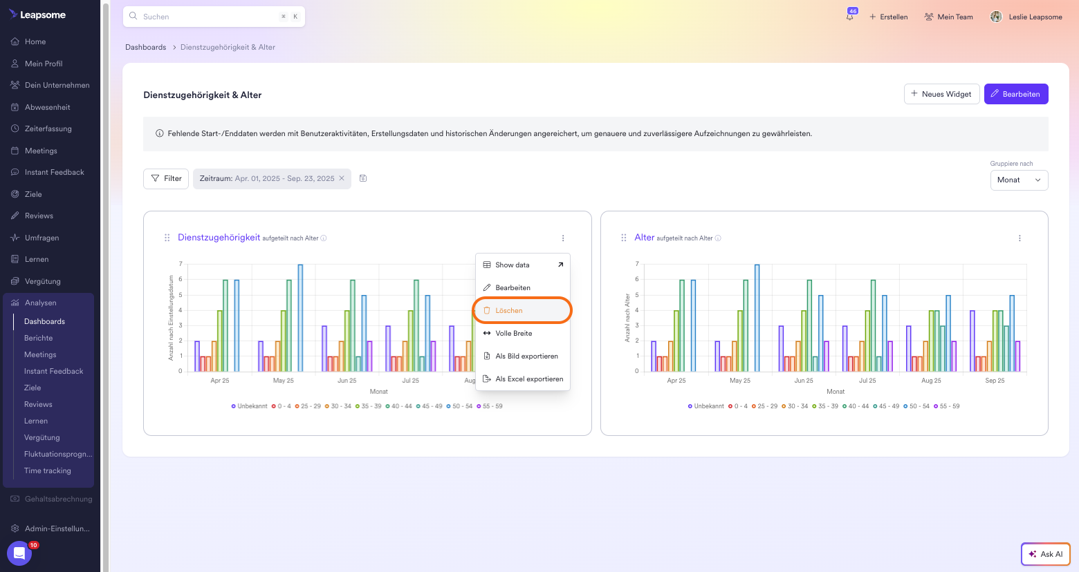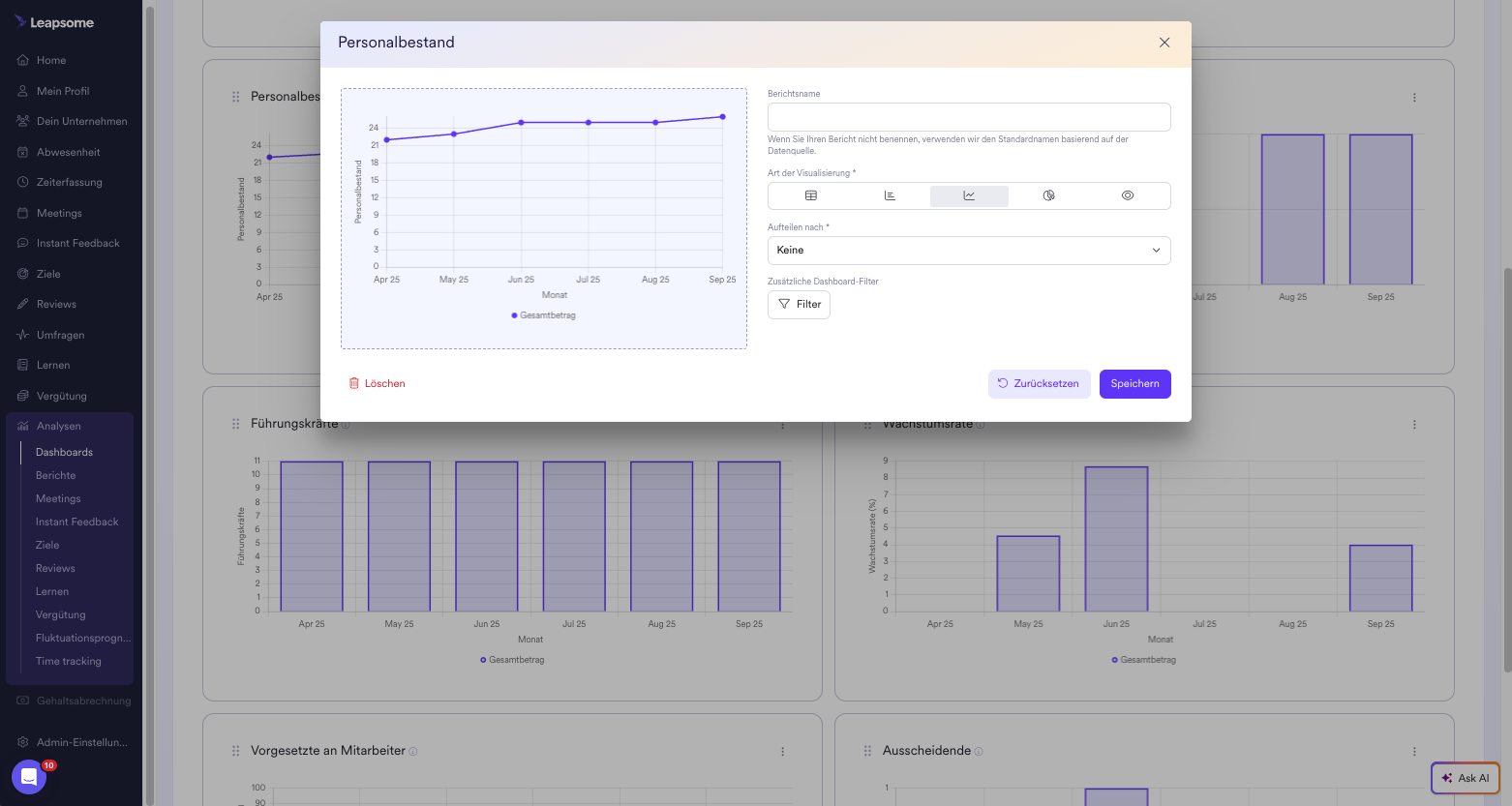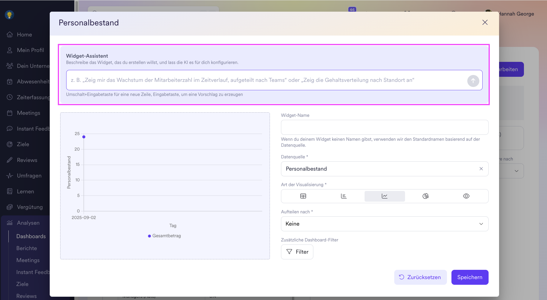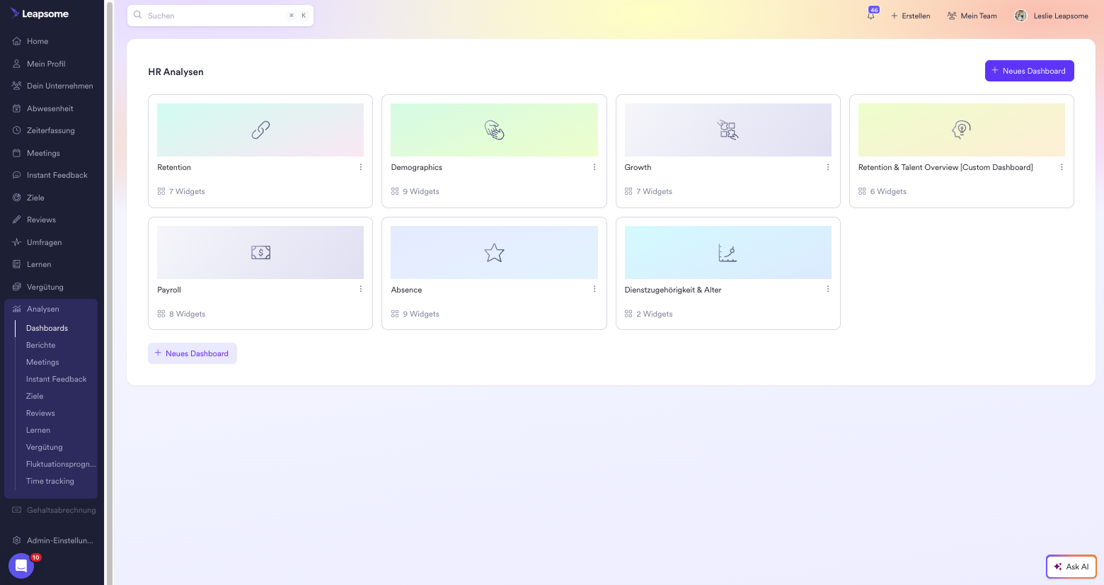 Die HR Analysen schaffen eine Möglichkeit für Admins, die gewünschten Änderungen und Statistiken ihrer Organisation zu überwachen. Personalisierbare Dashboards erweitern diese Fähigkeit, indem sie eine einfache und flexible Möglichkeit bieten, Dashboards zu erstellen und anzuzeigen, Mitarbeitendendaten zu visualisieren und wertvolle Einblicke zu gewinnen.