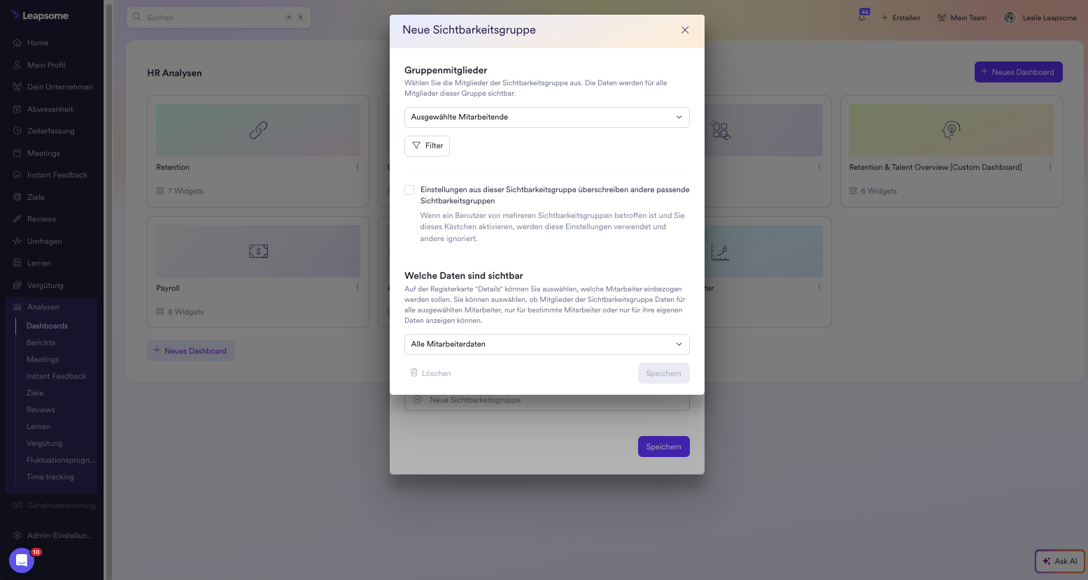 Um ein personalisierbares Dashboard zu erstellen, navigiere zu 'Analysen' > 'Dashboards' > '+ Neues Dashboard'. Im Pop-up-Fenster kannst du deinem Dashboard einen Titel geben (ein Pflichtfeld), ein Symbol auswählen (optional) und eine Beschreibung hinzufügen (optional). Danach wähle die Sichtbarkeit dieses Dashboards, indem du auf 'Neue Sichtbarkeitsgruppe' klickst. Dies erlaubt es dir, personalisierbare Dashboards mit granularer Sichtbarkeit zu erstellen, bei denen nur ausgewählte Gruppen das Dashboard sehen können. Du kannst zusätzlich auswählen, welche Daten diese Gruppe sehen kann. Optionen sind: 'Alle Mitarbeiterdaten', 'Spezifische Mitarbeiterdaten' oder 'Nur eigene Daten'. Wenn du 'Spezifische Mitarbeiterdaten' auswählst, kannst du die Filterfunktion nutzen, um festzulegen, welche Daten der Nutzenden der Gruppe angezeigt werden sollen. Falls die Gruppenmitglieder andere Nutzende verwalten, kannst du aus den dynamischen Filtern auswählen: