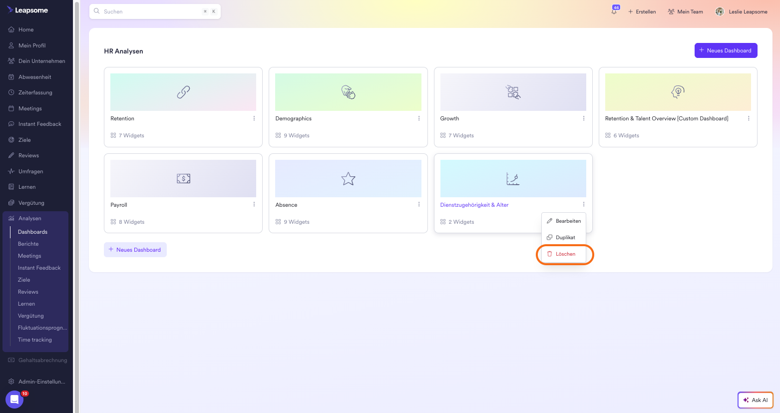 Um ein Dashboard zu löschen, klicke auf die drei vertikalen Punkte auf dem Dashboard und wähle die Option 'Löschen'.
