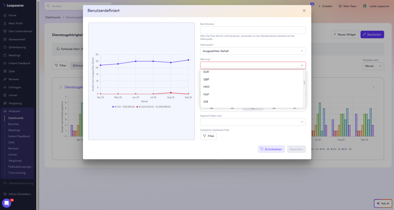 Personalisierbare Widgets in Employee Analytics enthalten Währungsfilterung, um eine genaue und aussagekräftige Gehaltsanalyse in deinem Unternehmen zu gewährleisten.