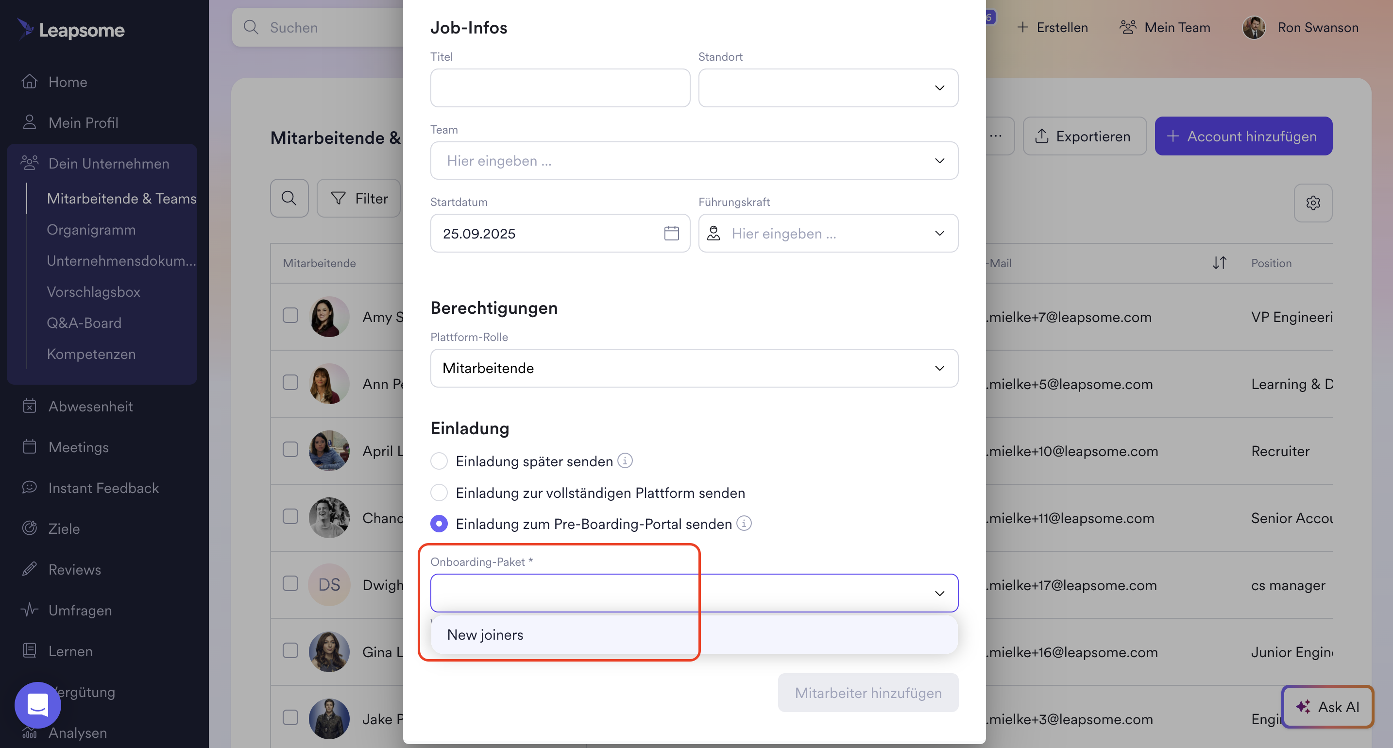 Mit dem Pre-Boarding-Portal haben Admins die Möglichkeit, neue, noch nicht eingeladene Nutzende automatisch mit eingeschränktem Zugriff auf Leapsome anzumelden, sodass sie wichtige Unternehmensdokumente einsehen können.