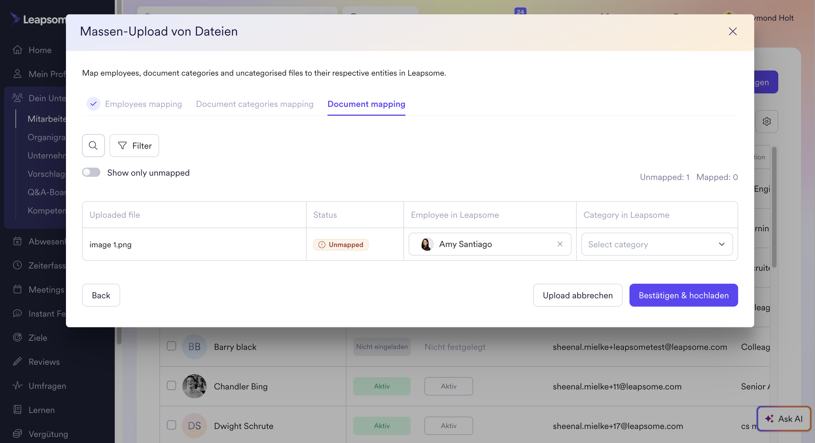 Nach dem Hochladen zeigt dir Leapsome, wie die Ordner zu den Nutzenden zugeordnet wurden. Du kannst diese Zuordnung überprüfen und bei Bedarf Korrekturen vornehmen, bevor du den Upload bestätigst. Das System wird automatisch Dokumente in die richtigen Kategorien basierend auf deinen Unterordnernamen platzieren.
