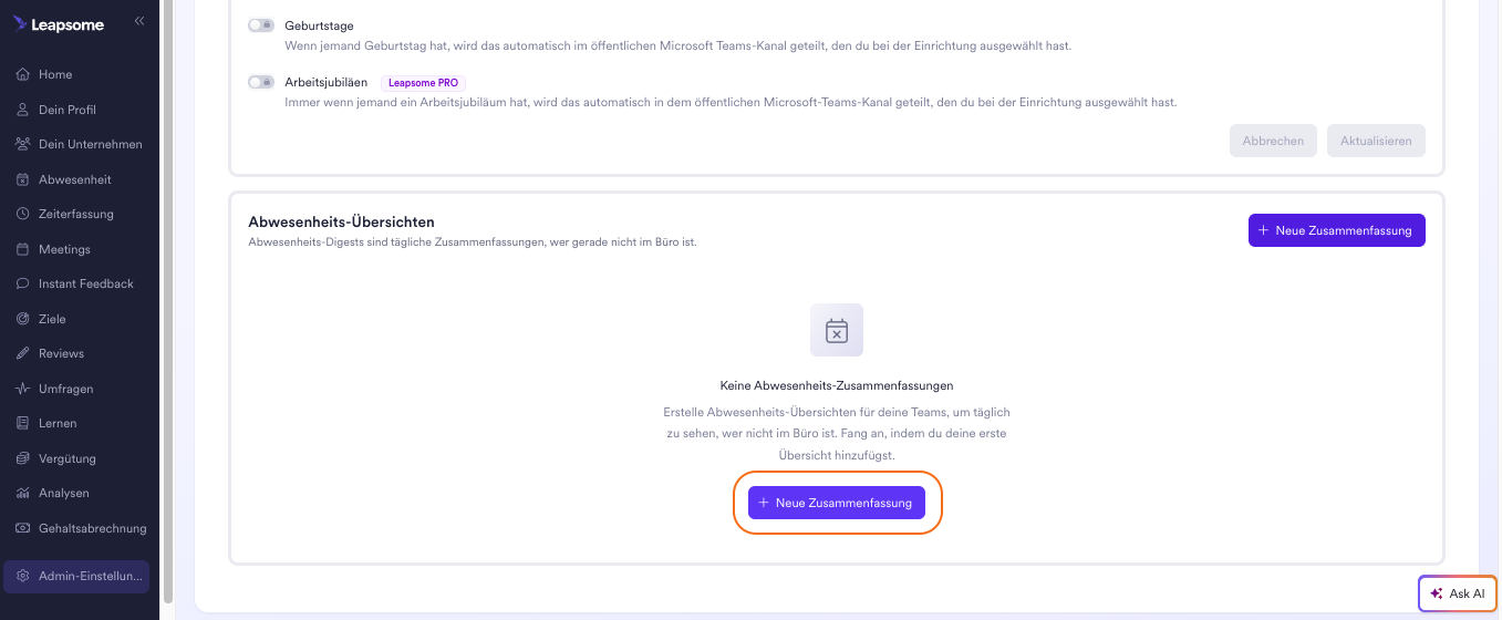 Bitte beachten: Diese Funktion ist nur für Unternehmen verfügbar, die das Abwesenheits-Modul von Leapsome nutzen.