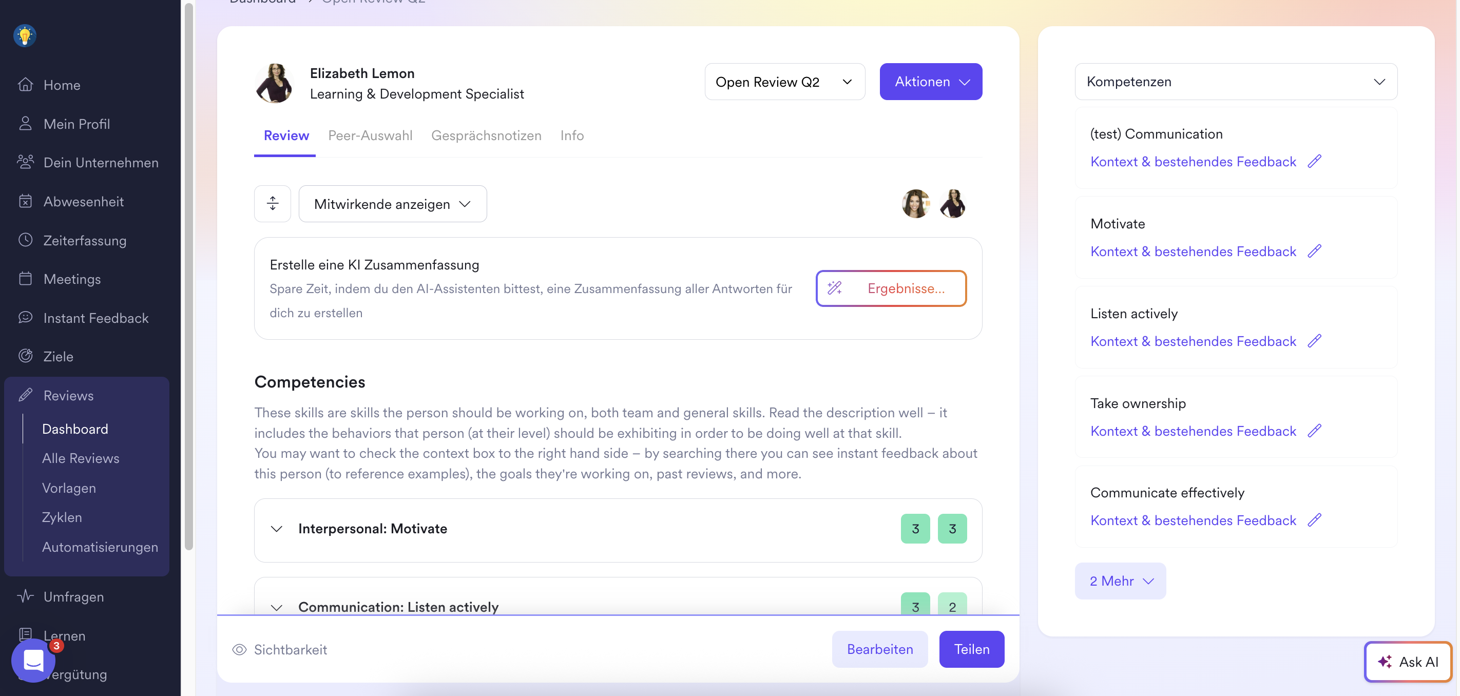 Schaue dir die Seite 'Reviews' an. Von hier aus kann das HR-Team jede Art von formellen Feedback Gesprächen (Performance Reviews, 360° Reviews, Leadership Reviews usw.) problemlos anpassen, starten und verwalten. Unsere Best-Practices helfen dir beim Aufsetzen des ersten Review Zyklus.
