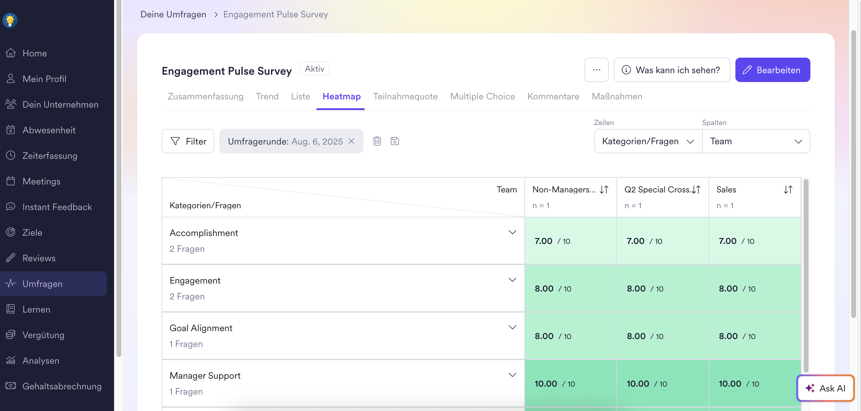 Siehe dir abschließend noch die Seite 'Umfragen' an. Hier kannst Du regelmäßige Engagement Umfragen erstellen und verschicken, um den Puls Ihres Unternehmens zu erfassen. Schaue dir unsere Best-Practices zum Umfrage Modul an.