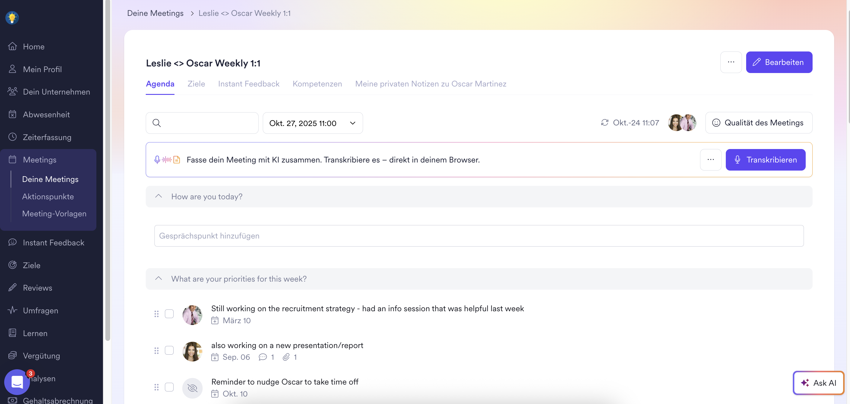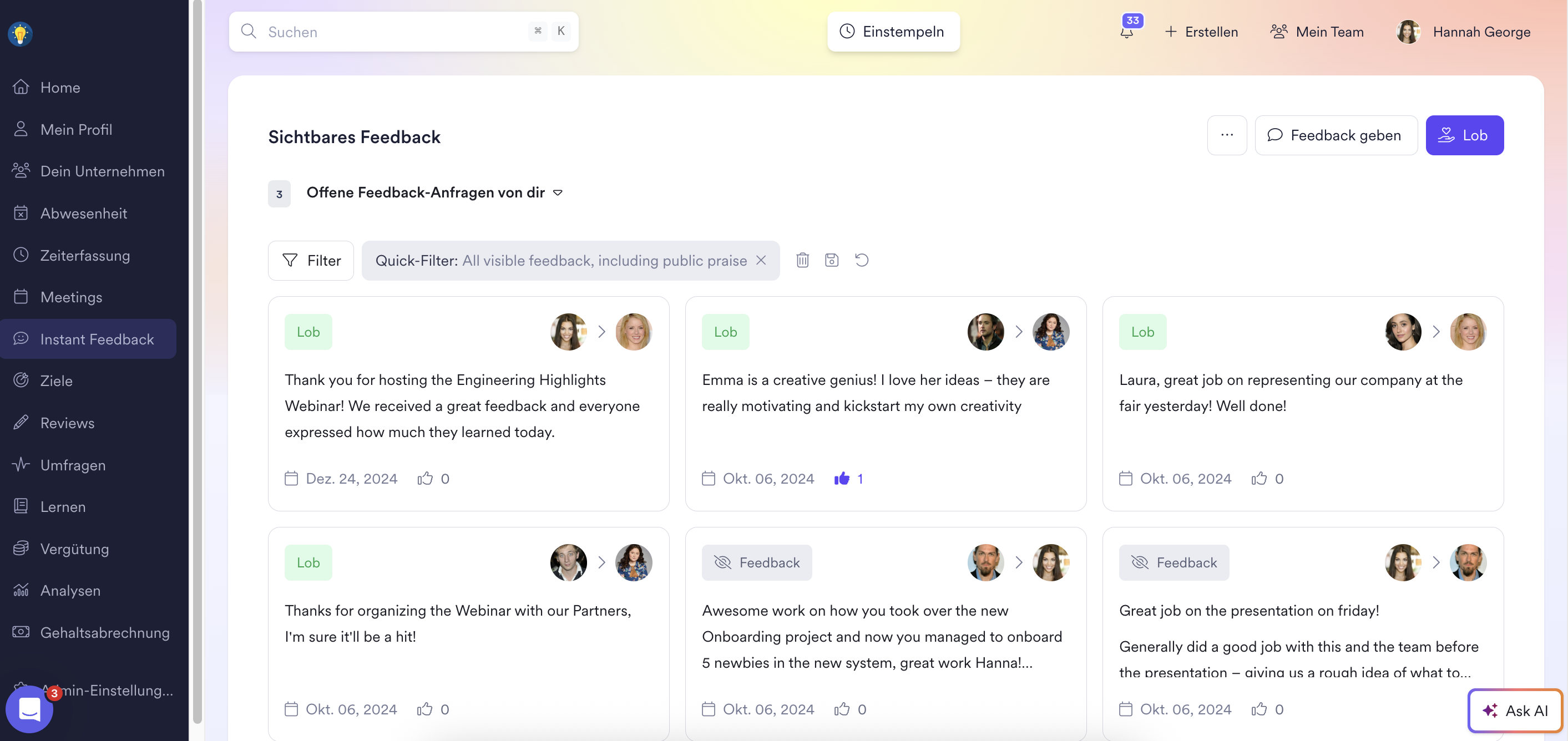 Gehe als nächstes zur Seite 'Meetings'. Über diese Registerkarte können Mitarbeiter jederzeit Feedback an alle anderen Mitarbeiter des Unternehmens geben oder von ihnen anfordern. Standardmäßig können nur der Sender und der Empfänger das Feedback sehen. Es kann offen oder strukturiert sein.