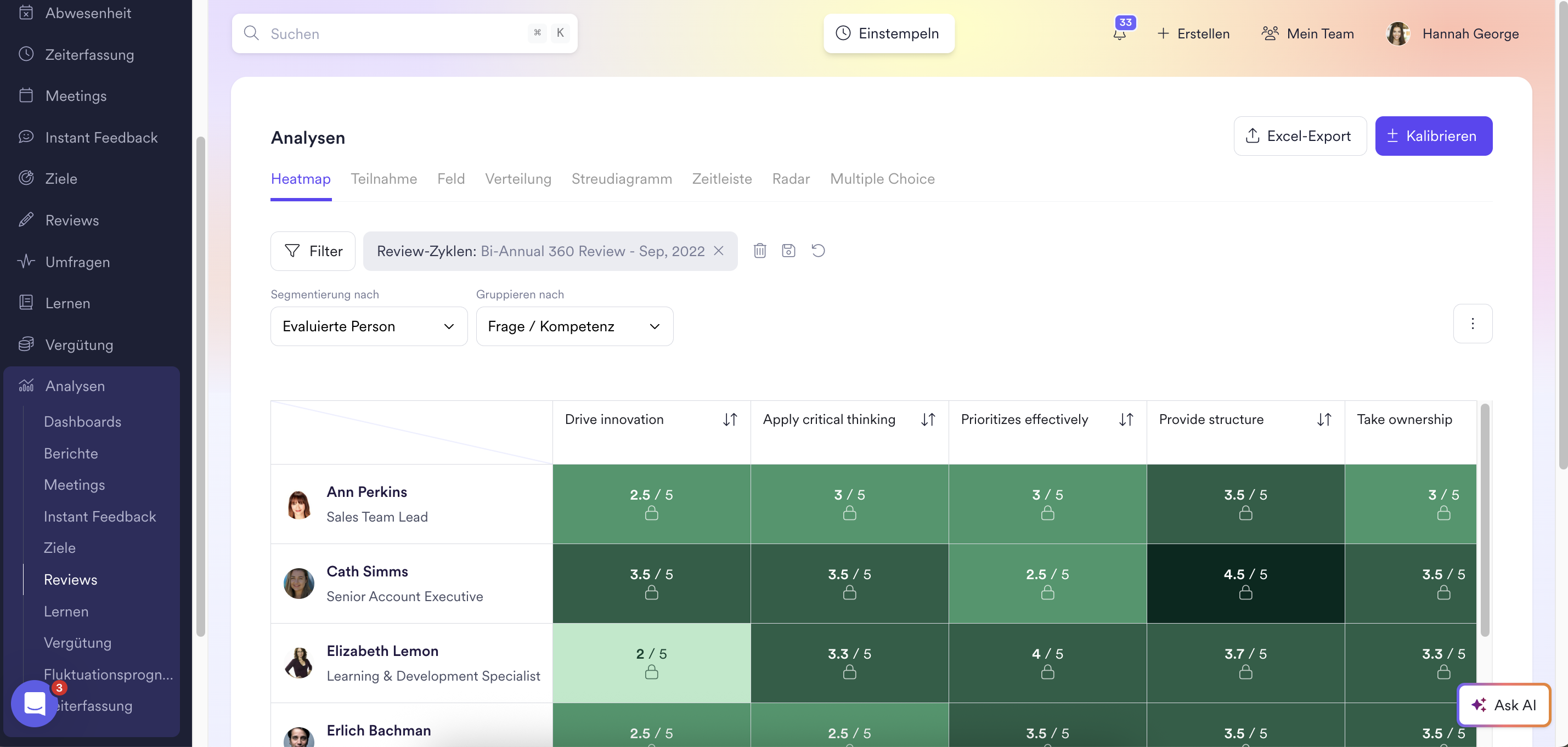 Über die Schaltfläche Analytics > Reviews findest du später detaillierte Analysen deiner Review-Zyklen - damit kannst du Teams vergleichen, Entwicklungen über die Zeit hinweg betrachten, etc.