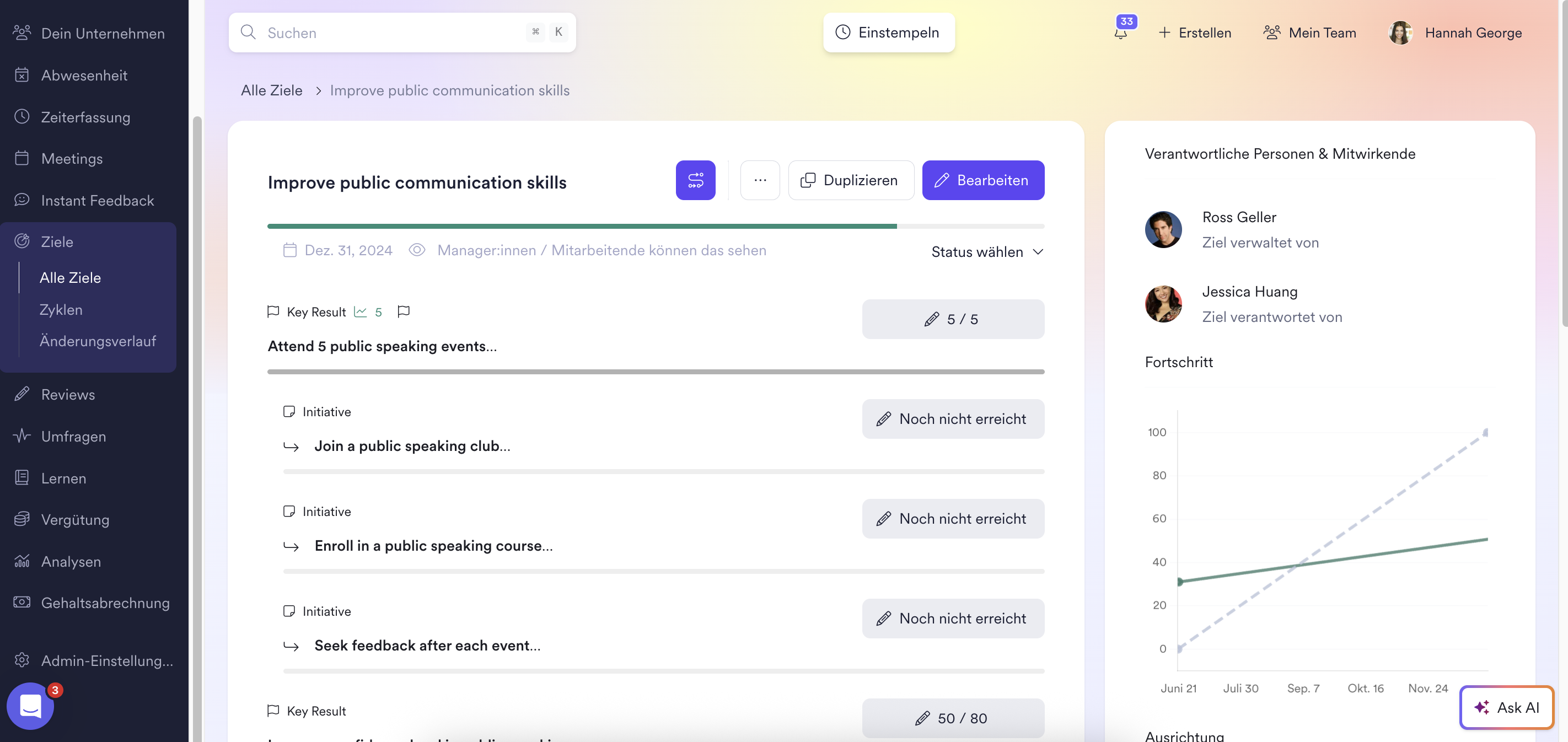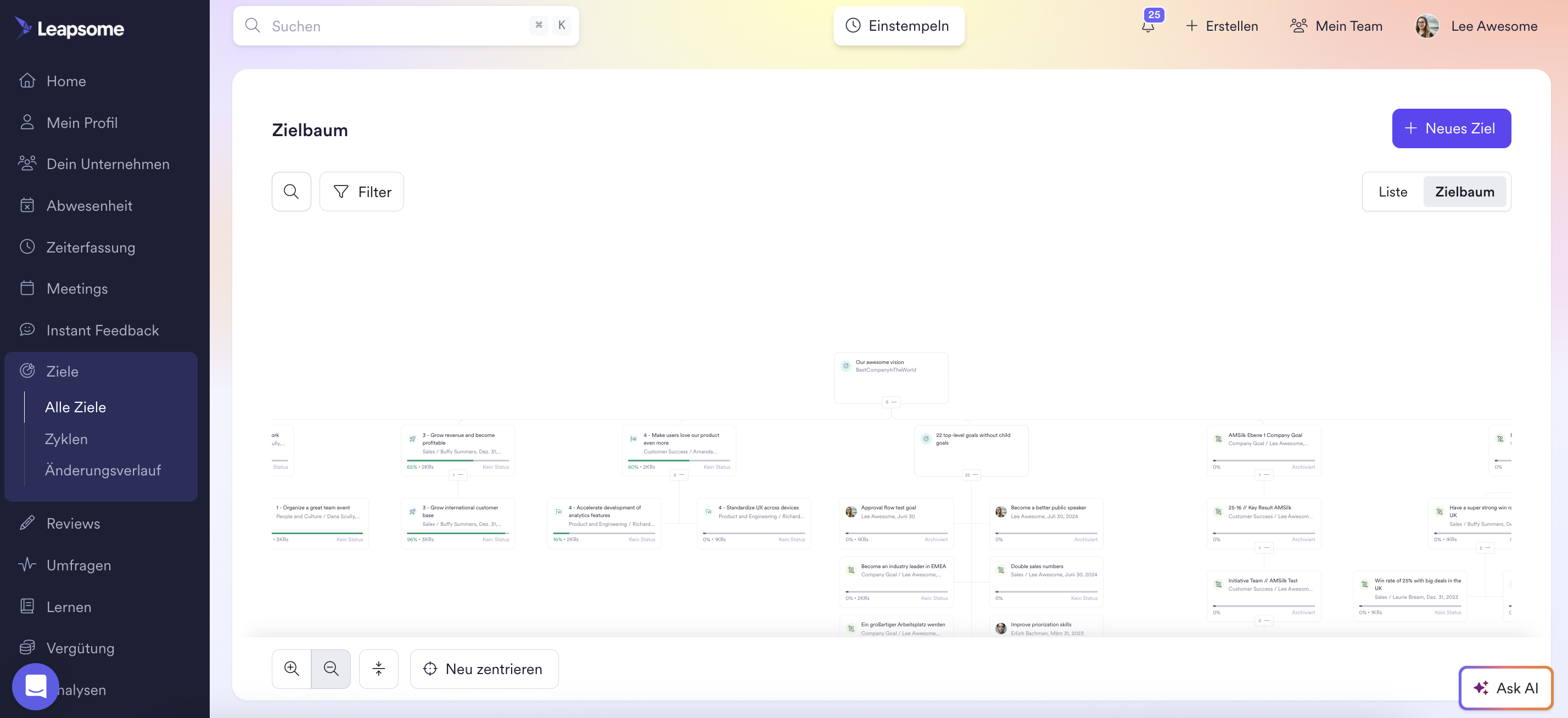 Gehe nun zur 'Ziele' Seite. Hier kannst Du individuelle, Team- oder Unternehmensziele festlegen. Das Modul ist flexibel - Du kannst traditionelle Zielsetzungsmethoden implementieren oder moderne OKRs verwenden. Schaue dir unsere Best-Practices für das Arbeiten mit Zielen an.
