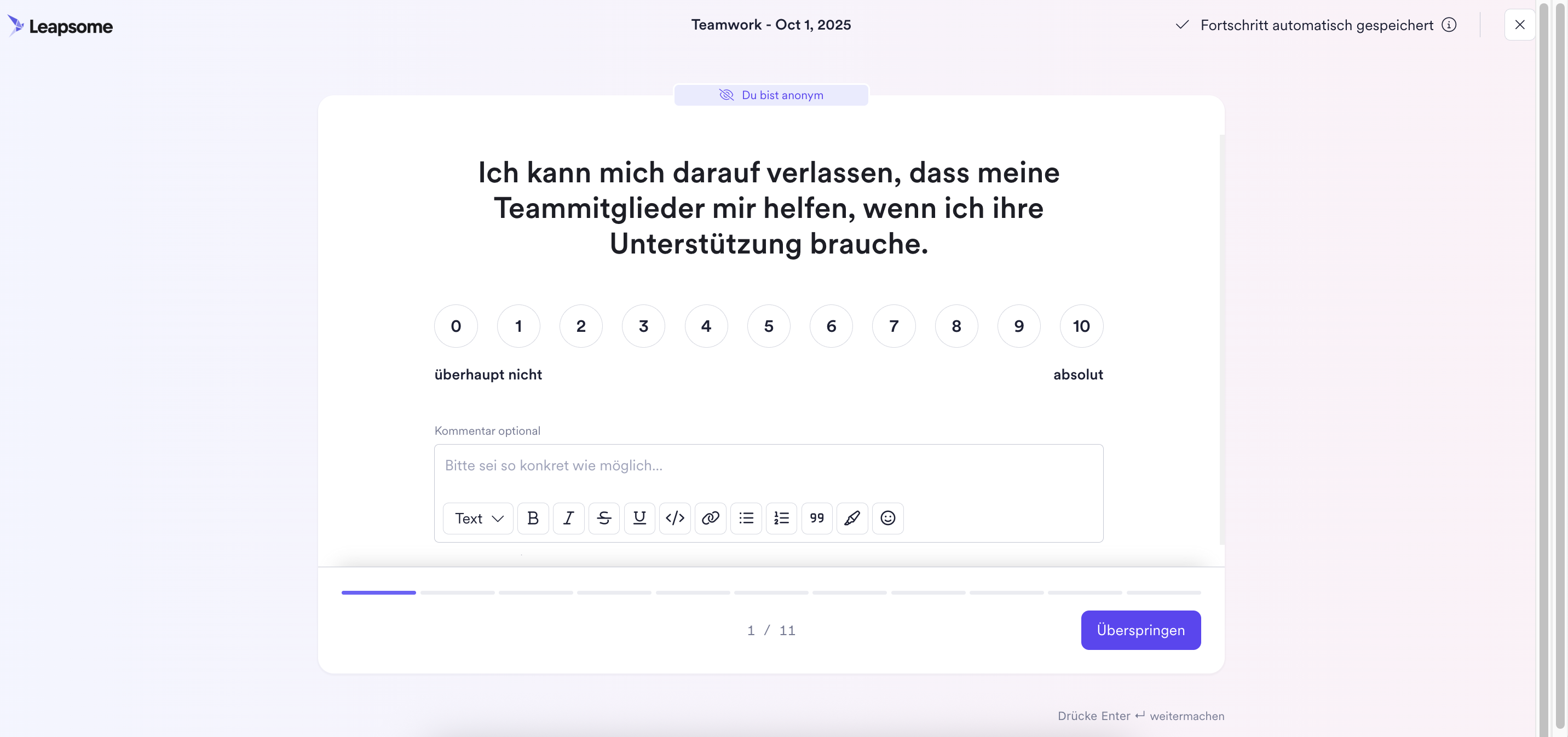 - Die Antworten der Umfrageteilnehmer bleiben anonym. So sieht der Fragebogen aus Sicht eines Teilnehmers aus (kein Login erforderlich):