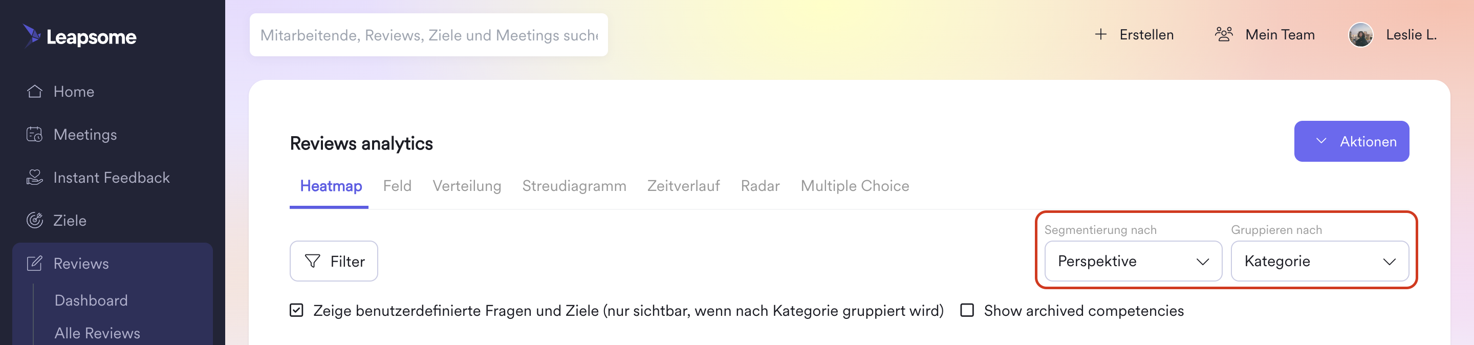 Bei der Analyse zeigt die Filterung nach der Bewertung der Führungskraft (Reviews > Analyse > Filter > Perspektive > Bewertungen der Führungskraft) nur die Bewertung der Haupt-Führungskraft an.