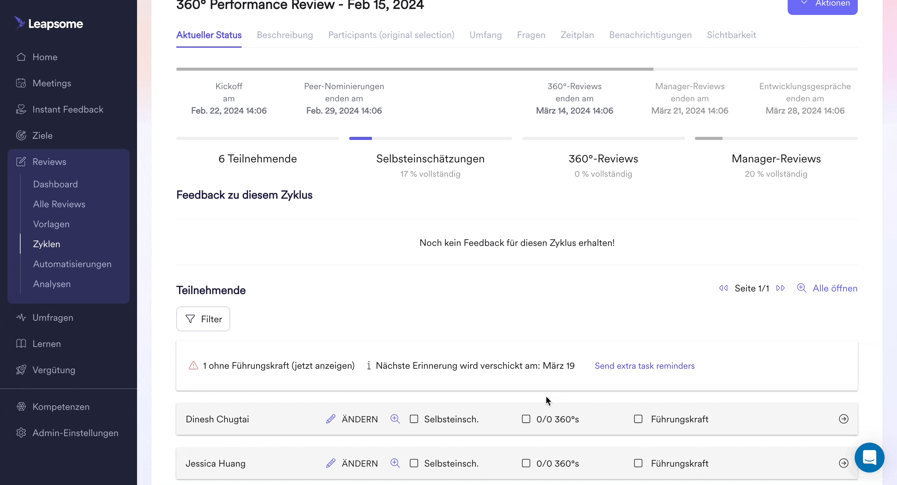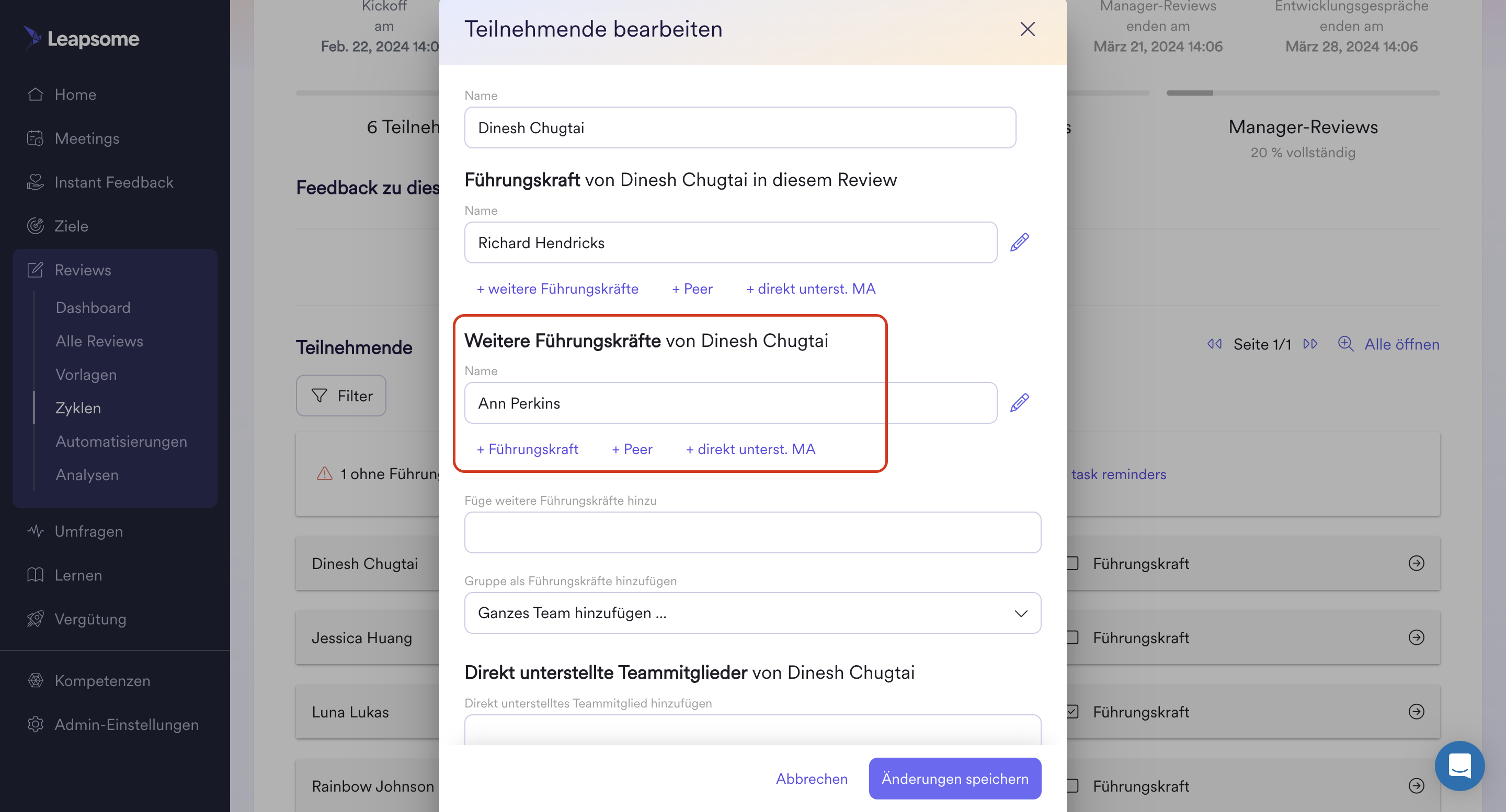 Als Admin kannst Du zusätzliche Führungskräfte über das Review Dashboard hinzufügen. Suche in der Teilnehmerliste nach dem entsprechenden Teilnehmer und klicke auf das 'Ändern' Symbol. Im daraufhin erscheinenden Pop-up-Fenster kannst Du die zusätzliche Führungskraft hinzufügen und die Einstellungen speichern.