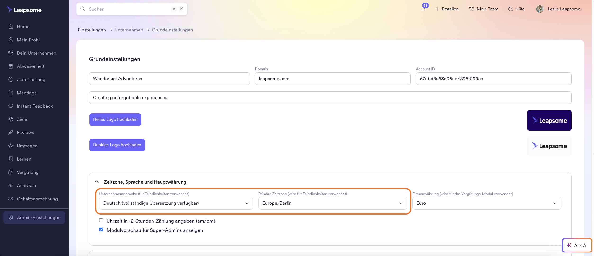 Unter 'Admin-Einstellungen' > 'Unternehmen' > 'Grundeinstellungen' kannst du eine dazugehörige Unternehmenssprache angeben, in welcher die Benachrichtigungen zu Geburtstagen und Arbeitsjubiläen verfasst werden. Indem du eine Primäre Zeitzone angibst, kannst du sicherstellen, dass die Benachrichtigungen zu Arbeitsjubiläen und Geburtstagen nicht außerhalb der Arbeitszeiten verschickt werden.