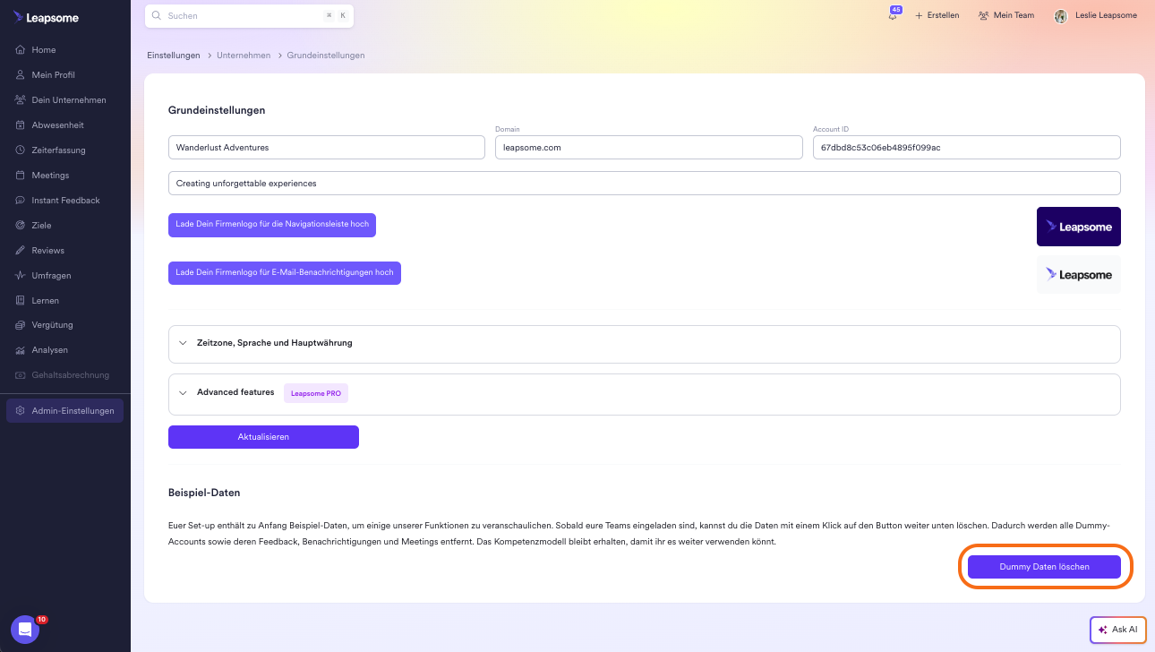 Wenn du damit beginnst, Leapsome mit deinem eigentlichen Team zu nutzen, solltest du diese Daten löschen. Gehe dazu auf 'Admin Einstellungen' > 'Unternehmen' > 'Grundeinstellungen', scrolle runter zu 'Beispiel-Daten' und klicke auf 'Dummy Daten löschen'. Diese Option besteht für vier Wochen nach dem Ende des Leapsome Trials.