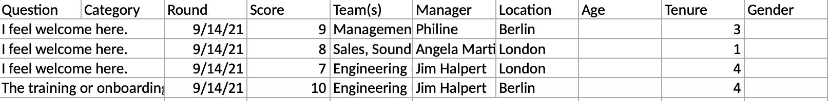 Der Export zeigt dir dann die demografischen Details der Teilnehmenden pro Frage. Bitte beachte, dass die Anonymitätsschwelle, die du für die Umfrage festgelegt hast, nicht berücksichtigt wird. Du würdest also Ergebnisse sehen, die unter der Schwelle liegen, weshalb der Export von Rohdaten nicht empfohlen wird.Der Export für Admins sieht folgendermaßen aus: