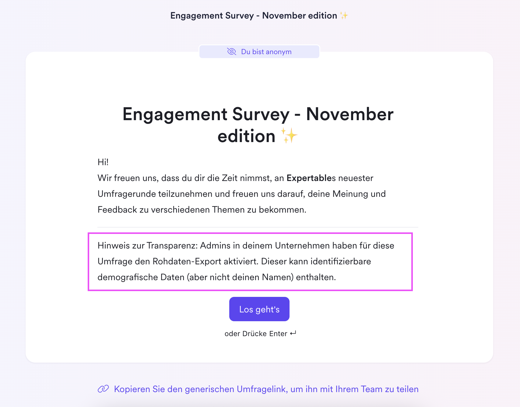 Falls Du den Export aktivierst, werden die Umfrageteilnehmer beim Ausfüllen der Umfrage darüber informiert, dass die Rohdaten exportiert werden können und sie somit möglicherweise identifiziert werden können.