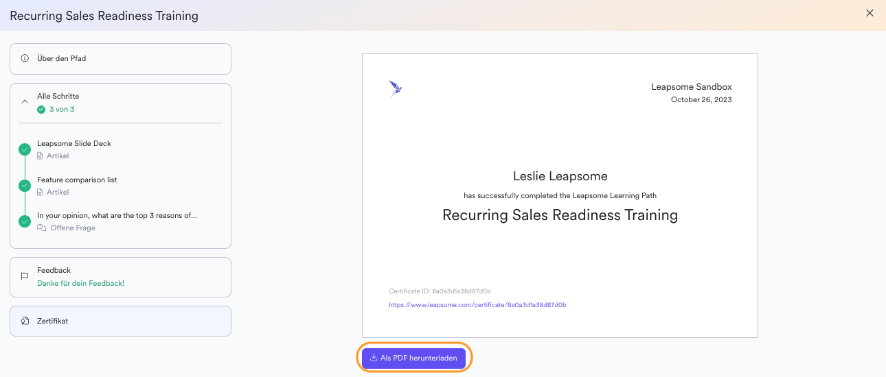 Du hast auch Zugriff darauf, deine Lernzertifikate anzusehen und herunterzuladen, sobald du einen Lernpfad abgeschlossen hast. Dies kann im letzten Schritt des Lernpfads oder durch das Aufrufen des abgeschlossenen Lernpfads und Klicken auf 'Zertifikat' erfolgen, woraufhin die Option zum Herunterladen des Zertifikats als PDF erscheint.