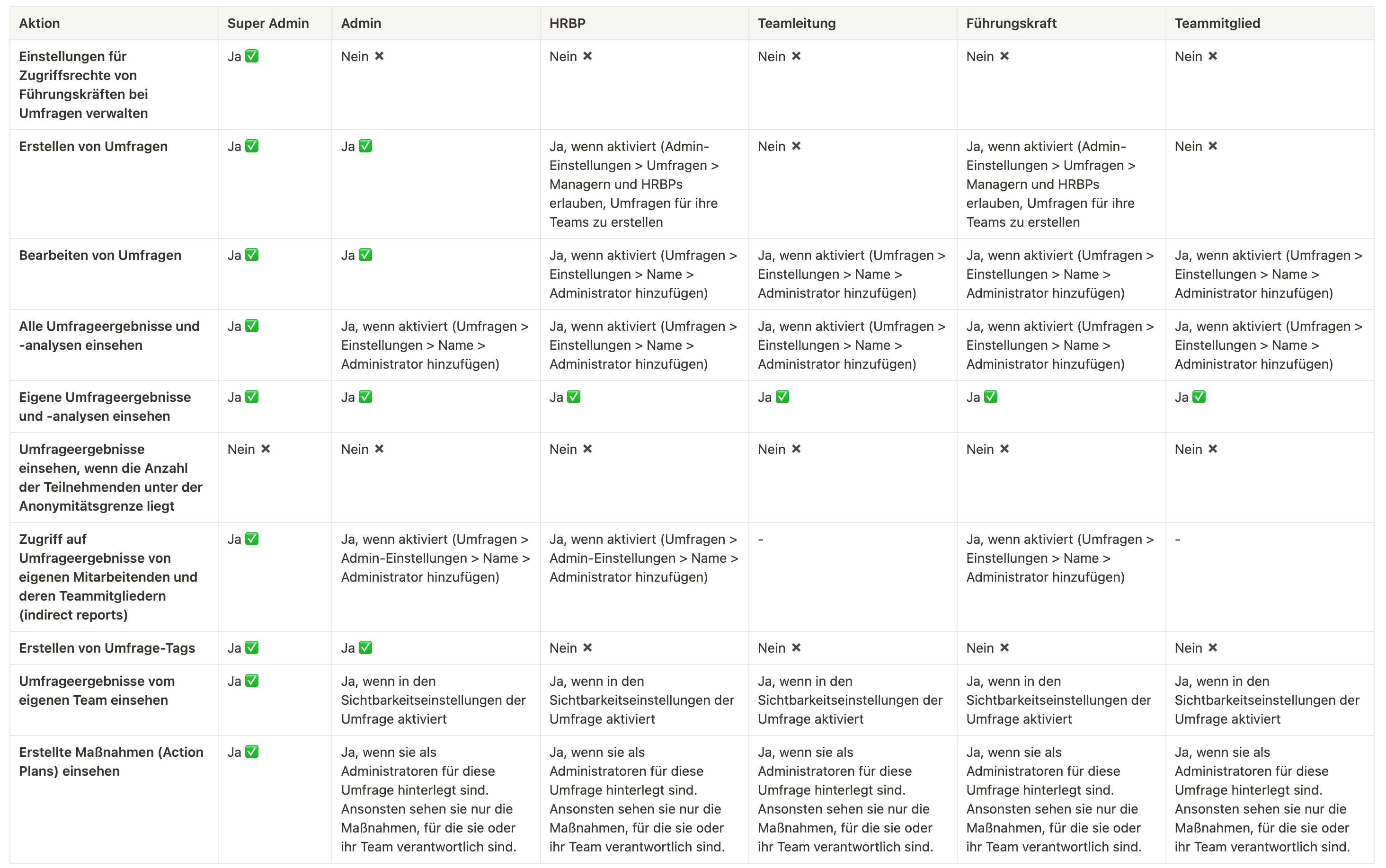 Mit der folgenden Matrix erhältst Du einen Überblick über die Umfragen Zugriffs- und Sichtbarkeitsrechte von (Super) Admins, Team Leads, Manager und Benutzern. Weitere Informationen zu den Zugriffs- und Sichtbarkeitsrechten von 'zusätzlichen Führungskräften' findest Du in diesem Artikel.