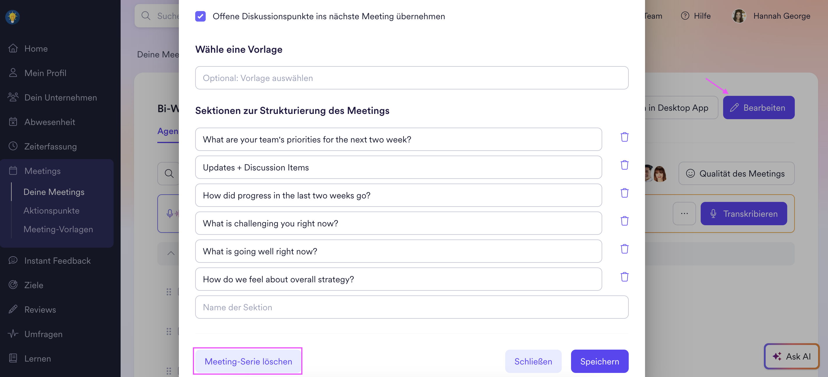 Wenn ein Meeting für dich nicht mehr relevant ist, kannst du die Meeting-Serie entfernen. Durch das Entfernen einer Meeting-Serie wird das Meeting archiviert und unter 'Zeige entfernte Meetings' verschoben. Alle Meeting-Daten bleiben erhalten und das Meeting kann bei Bedarf wiederhergestellt werden. Um die Meeting-Serie zu entfernen, klicke auf den 'Bearbeiten'-Button deines Meetings, scrolle nach unten und klicke auf den 'Meeting-Serie löschen'-Button.