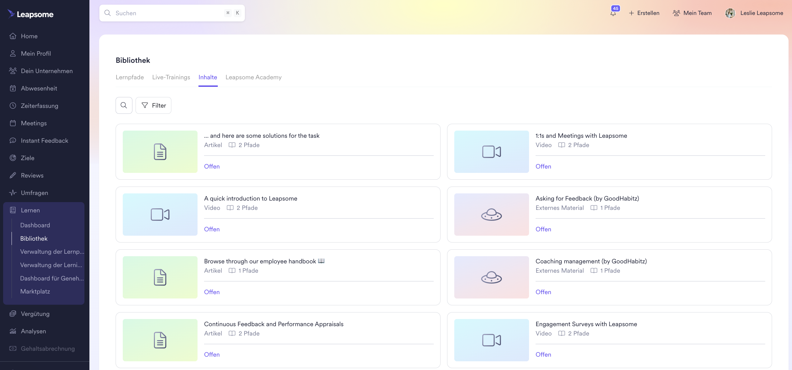 Durch die Navigation zur 'Bibliothek' findest du alle Lernpfade, in die du dich einschreiben kannst, alle Lerninhalte, auf die du Zugriff hast, sowie Live-Trainings.
