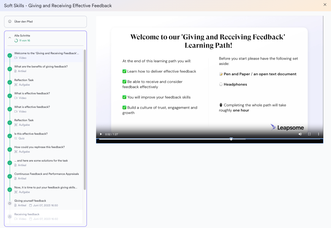 - Du kannst dann auf den ersten Schritt zugreifen. Das Starten des ersten Schritts öffnet ein Pop-up-Fenster für das erste Lernelement (Artikel, Video, Aufgabe oder Quiz). Auf diese Weise führt dich Leapsome durch den Lernpfad. Du klickst auf 'Ich habe die Aufgabe abgeschlossen' in der unteren rechten Ecke, wenn du fertig bist.