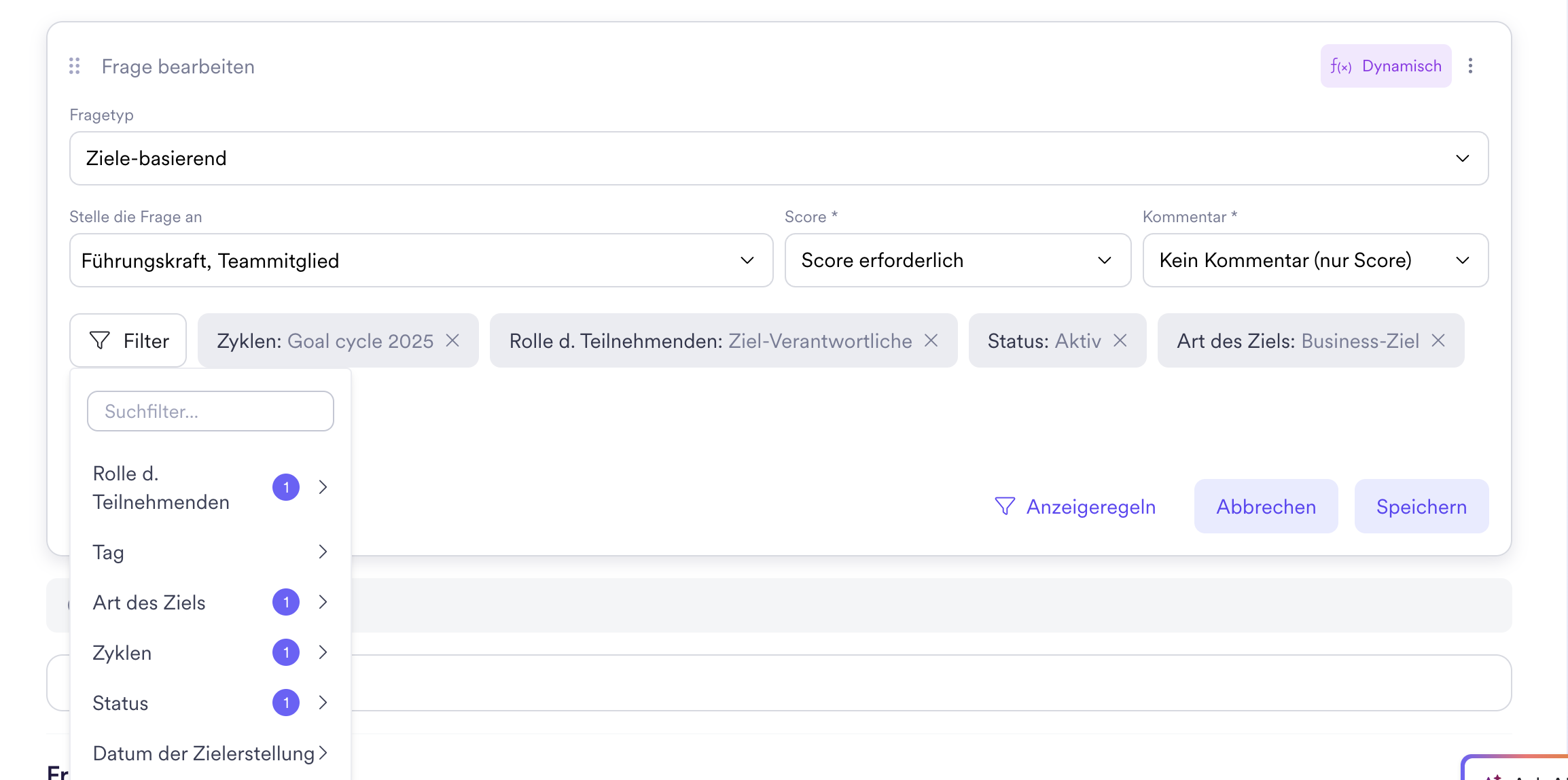 Wenn du die Option aktiviert hast, wird automatisch eine zusätzliche Frage für jedes Ziel erstellt, das die Selektionskriterien erfüllt. Standardmäßig sind hier individuelle, aktive Ziele ausgewählt. Zur genauen Auswahl der Ziele stehen dir hier jedoch folgende Attribute zur Verfügung: