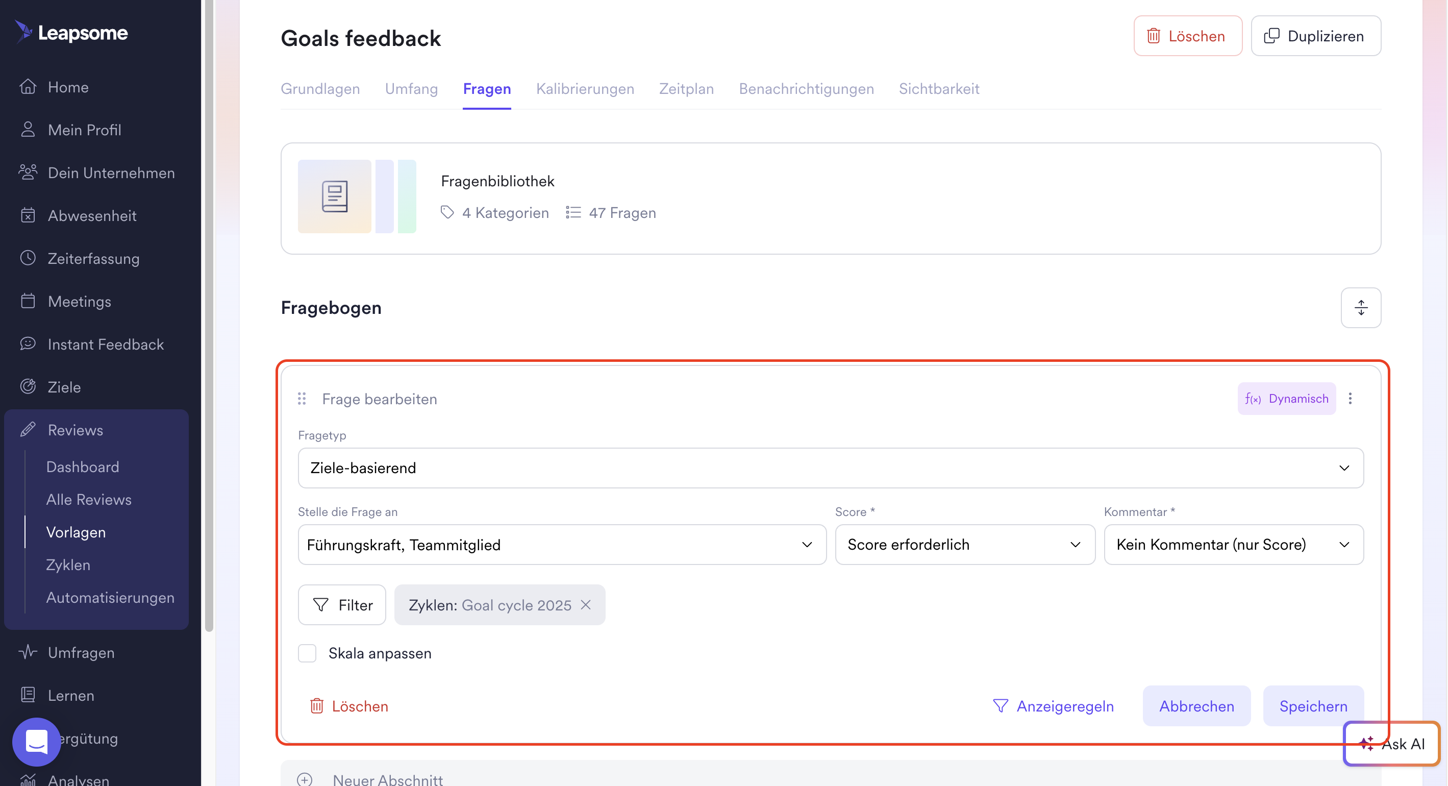 Mache dir keine Sorgen, wenn zum Zeitpunkt der Aktivierung des Cycle nicht alle Ziele in Leapsome angelegt sind. Solange der Zyklus offen und die Reviews noch nicht durch die Teilnehmenden abgeschickt sind, fügt Leapsome fortlaufend automatisch alle in der Zwischenzeit neu hinzugefügten Ziele, die den definierten Kriterien entsprechen, mit ein. Leapsome fügt neue geeignete Ziele nur solange zum Review hinzu, bis die Führungskraft und/oder die teilnehmende Person das Feedback finalisiert haben. Um auch danach noch neue Ziele mit einzubinden, müssen beide Parteien ihr Feedback wieder 'Bearbeiten', woraufhin alle neuen Ziele, die den gesetzten Kriterien entsprechen, mit im Review auftauchen.