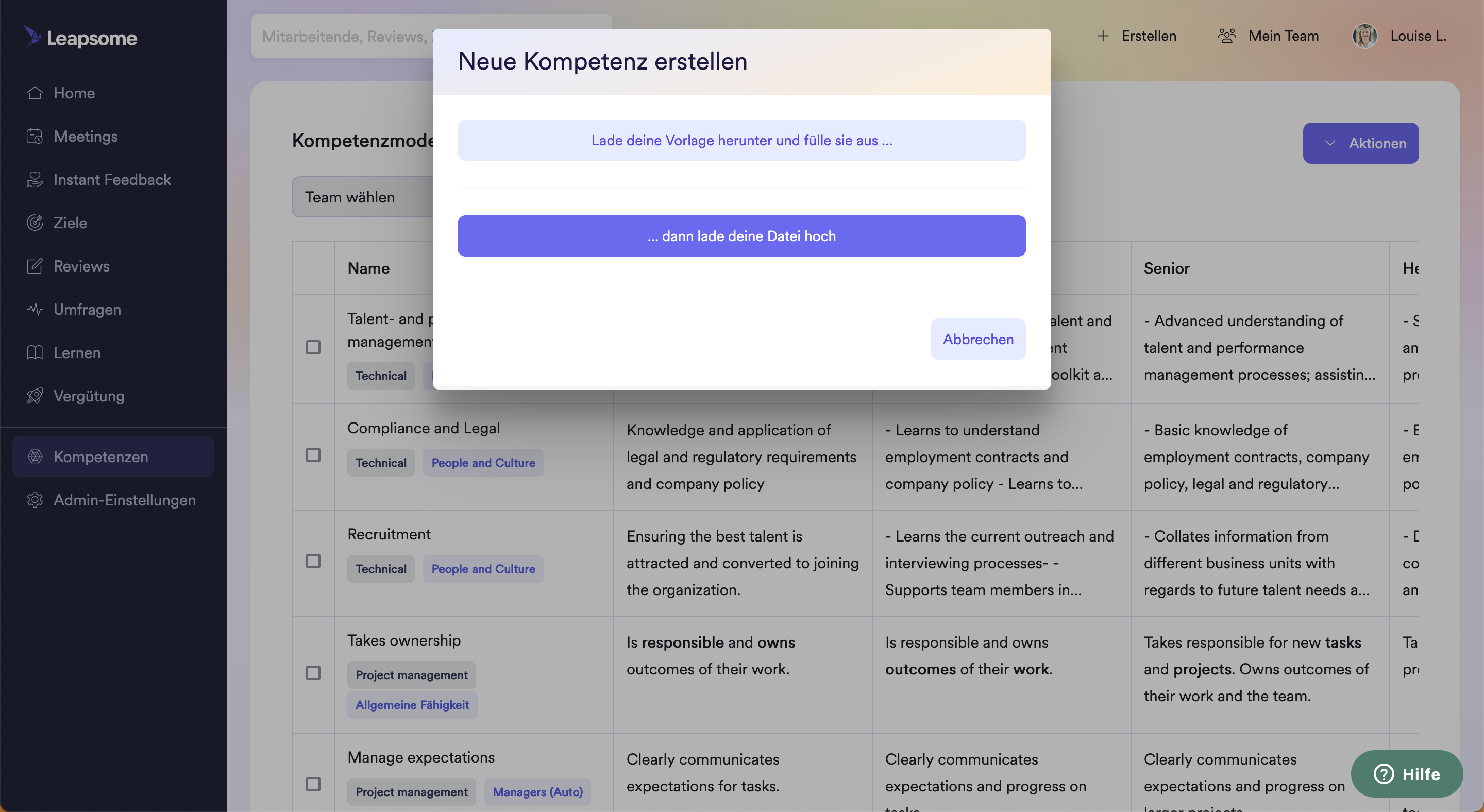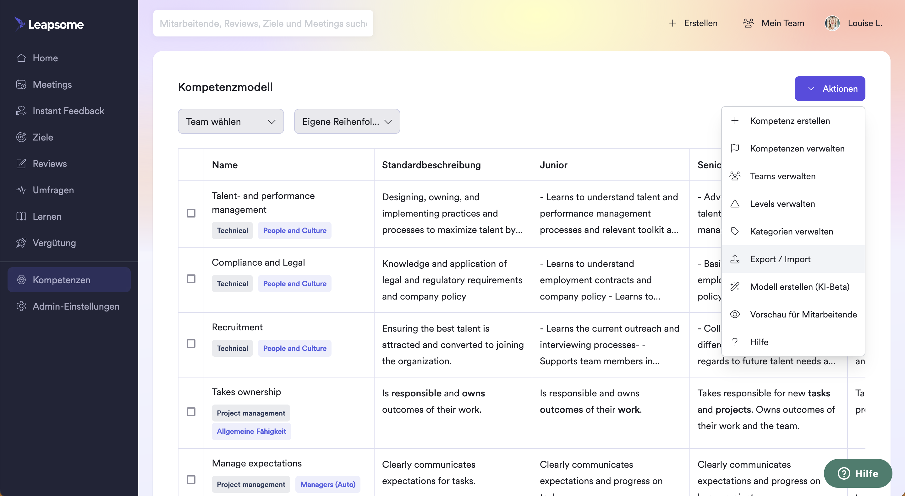 Um bestehende Kompetenzen aus dem Kompetenzmodell in Leapsome zu exportieren, oder neue Kompetenzen zu importieren, öffnest du in Leapsome das Kompetenzmodell und navigierst auf Aktionen > Export / Import.
