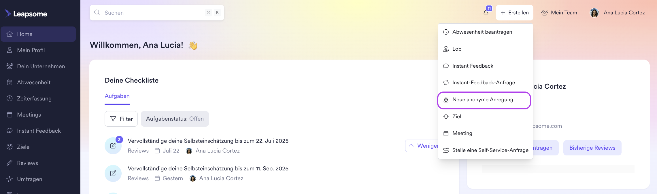 Mitarbeitende können anonyme Vorschläge einreichen, indem sie auf „Erstellen“ und anschließend auf „Neue anonyme Anregung“ klicken. Nur Super Admins oder Verantwortliche der Vorschlagsbox erhalten eine Benachrichtigung über den eingereichten anonymen Vorschlag an ihre E-Mail, die direkt mit dem jeweiligen Vorschlag verlinkt ist. Um die Anonymität zu wahren, werden diese Benachrichtigungen nicht im Benachrichtigungsmenü angezeigt.