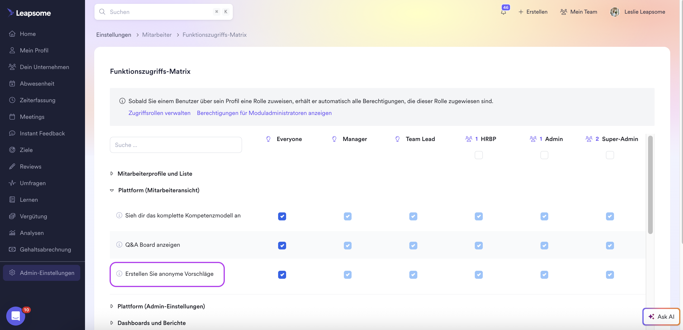 Um die Option zu aktivieren, dass Mitarbeitende anonyme Vorschläge einreichen können, muss der Super Admin zu Admin-Einstellungen > Mitarbeiter > Funktionszugriffs-Matrix > Erstellen Sie anonyme Vorschläge. Auf diese Weise können alle Mitarbeitenden anonyme Vorschläge direkt an die Super Admins/ausgewählten Verantwortlichen übermitteln.