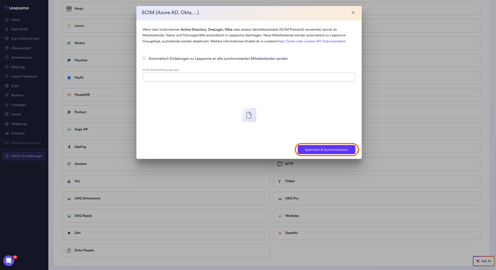 Um unsere SCIM API zu nutzen, musst du zunächst einen SCIM API Token in Leapsome erstellen. Navigiere hierfür zu Admin-Einstellungen > Integrationen und Importe > SCIM (Azure AD, Okta, ...).
