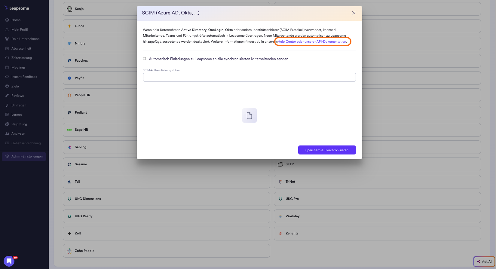 Du kannst mit deinem Leapsome-Account auf unsere SCIM API Dokumentation zugreifen. Gehe hierfür wieder in die Integrationseinstellungen, und klicke auf 'API Dokumentation'.