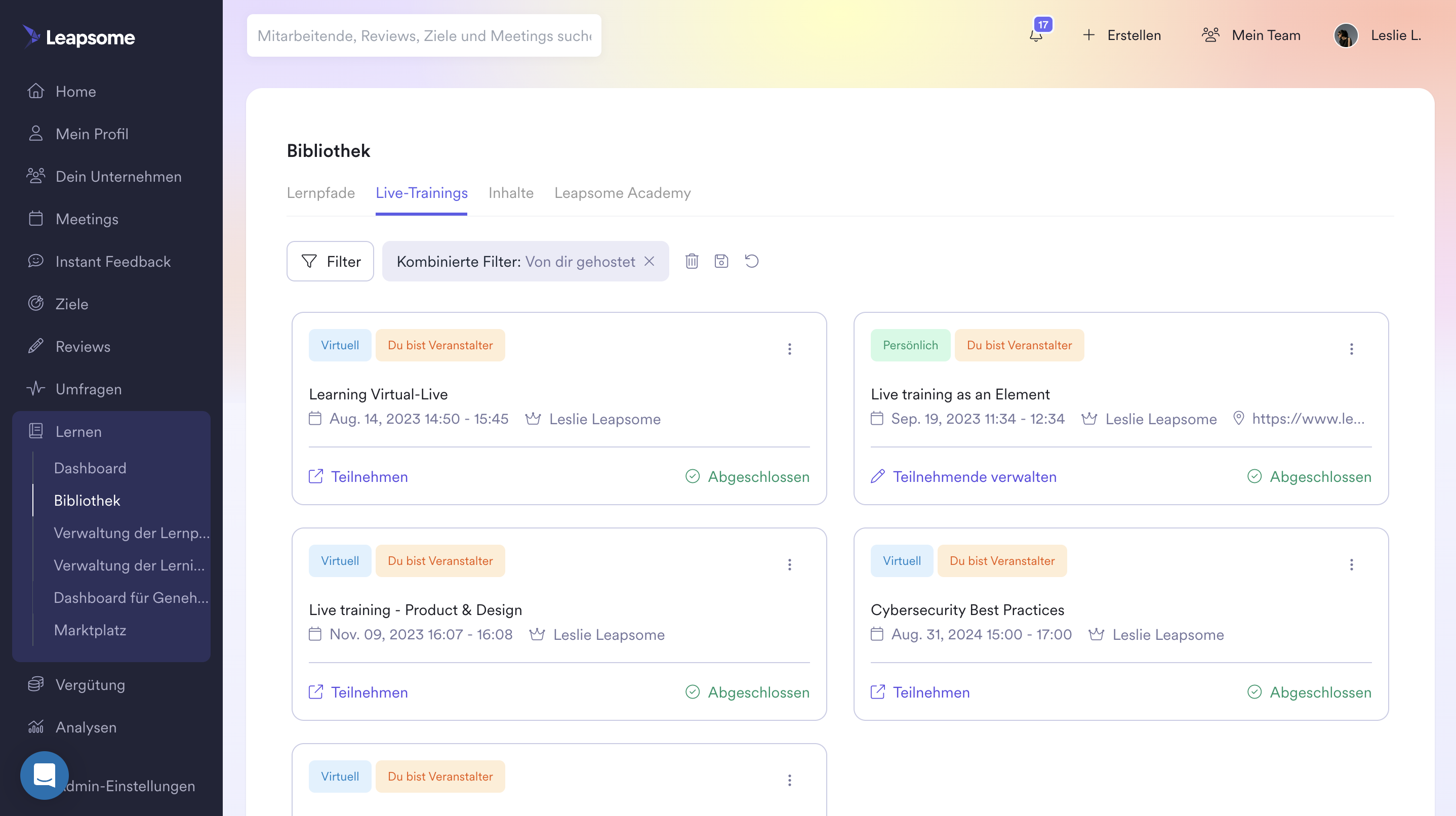 - Bibliothek: Lernpfade mit Live-Trainingselementen.