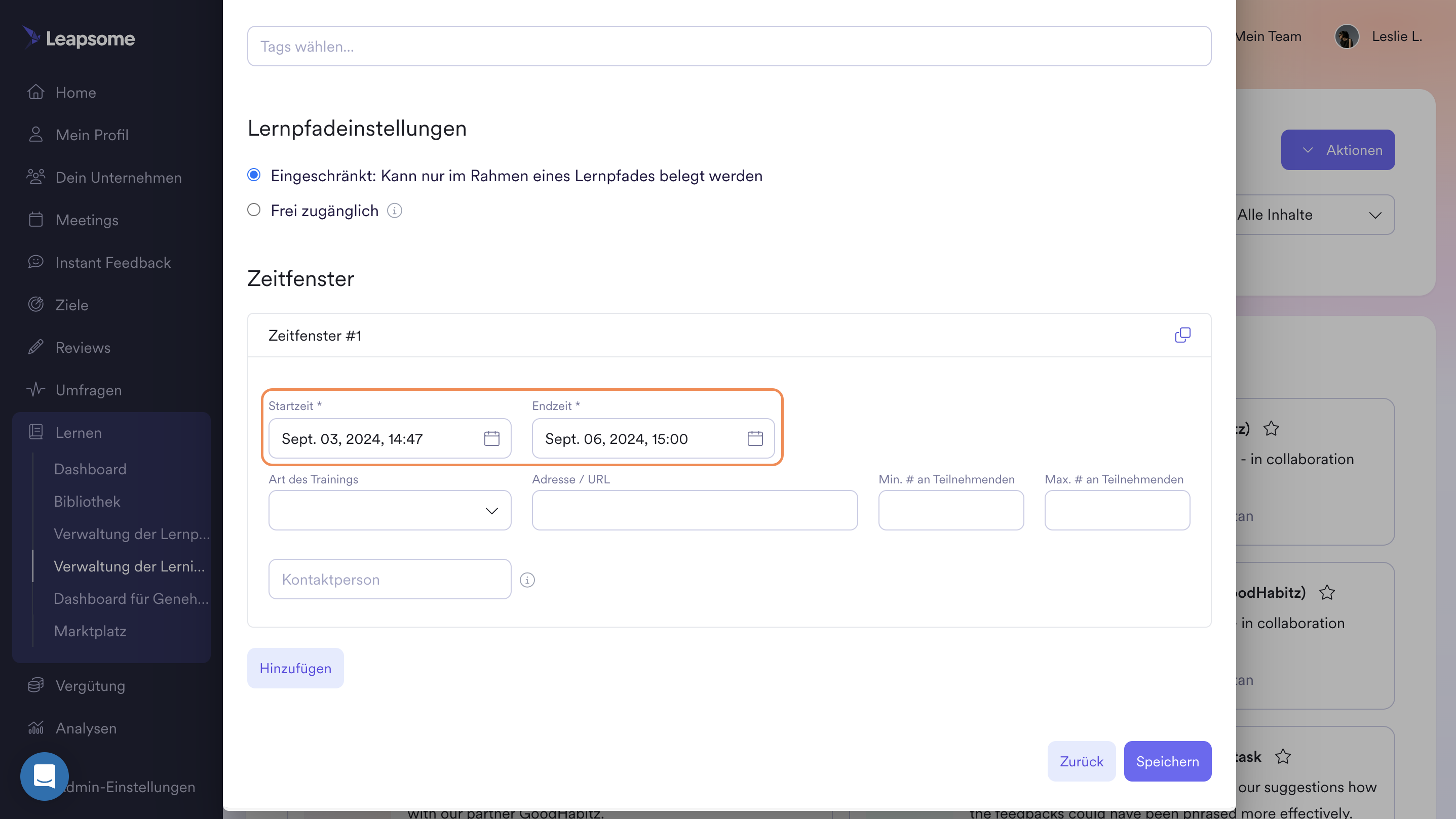 Wenn du das Lernelement 'Live-Training' erstellst kannst du mehrere Zeitfenster für verfügbare Termine hinzufügen. Jedes Zeitfenster muss die folgenden Informationen enthalten:
