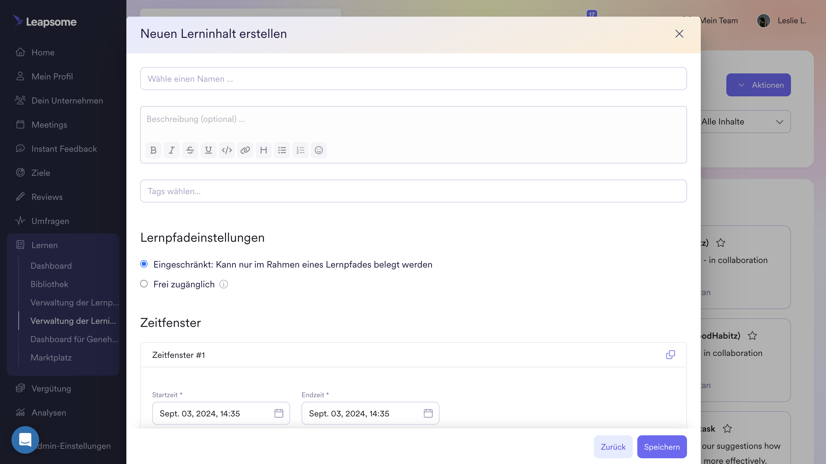 Manchmal kann ein Live-Training über mehrere Tage dauern. In Leapsome kannst du beim Einrichten eines Live-Trainings ('Einstellungen' > 'Elemente-Verwaltung' > 'Aktionen' > 'Neues Lernelement erstellen' > 'Live-Training') unterschiedliche Start- und Enddaten auswählen, um anzugeben, dass dieses Live-Training über mehrere Tage geplant ist.