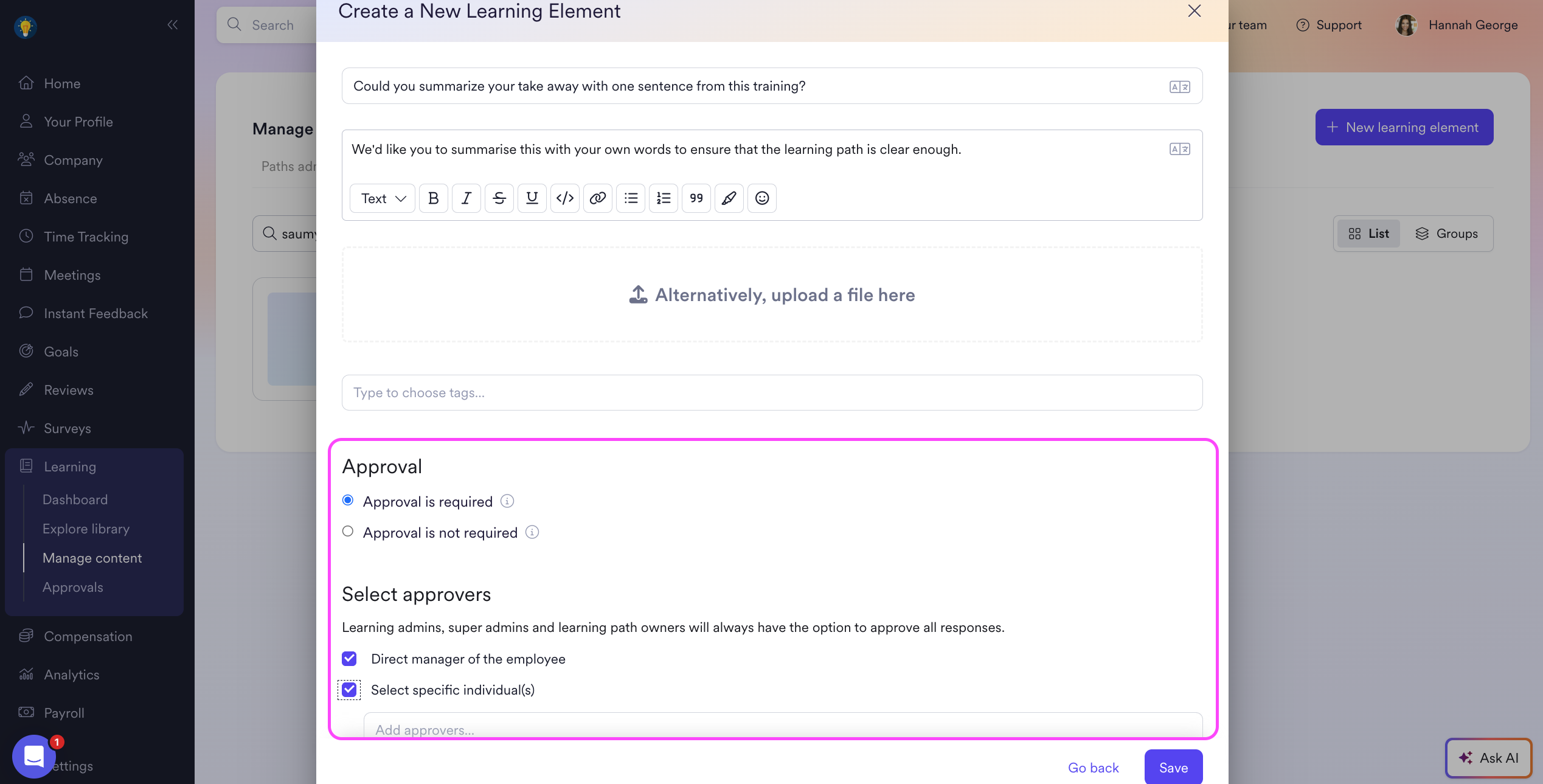 Please note: Learning admins and super admins can always approve all responses, regardless of the configured approvers.