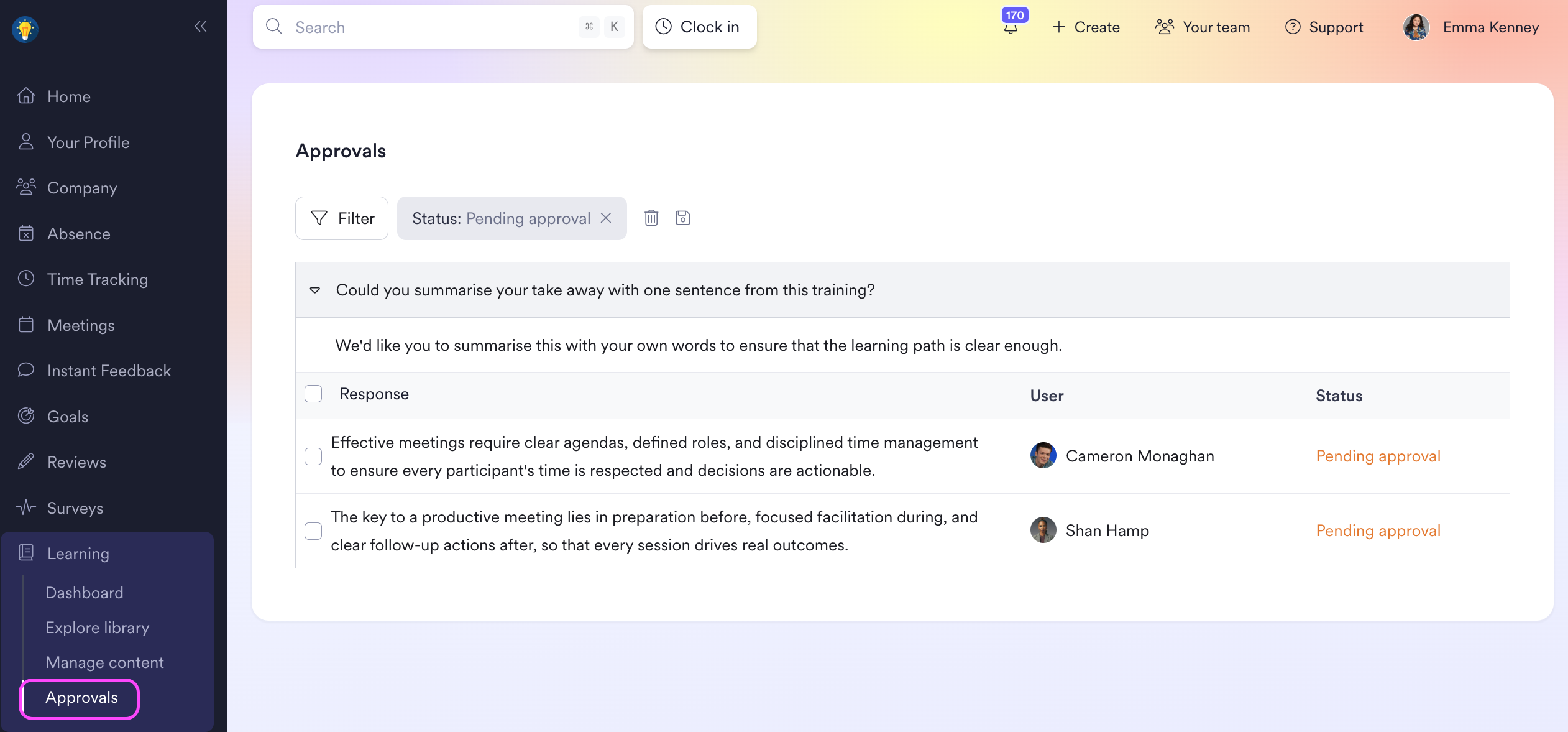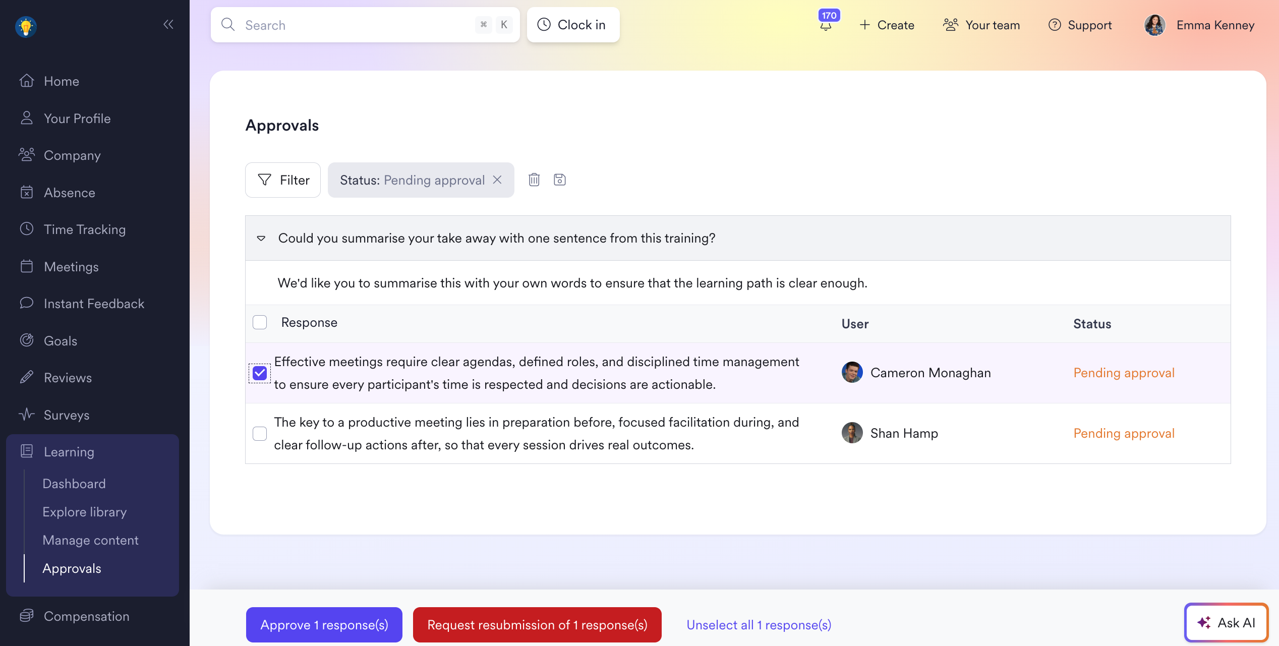 The Approval Dashboard in the Learning module provides a centralized location where admins, managers, and designated approvers can review and approve responses to open questions within learning paths. When creating learning paths with open questions, you can require approval before participants progress, ensuring quality control and proper oversight of learning outcomes. This feature enables structured learning with checkpoints, allowing you to verify understanding and provide feedback before learners advance.