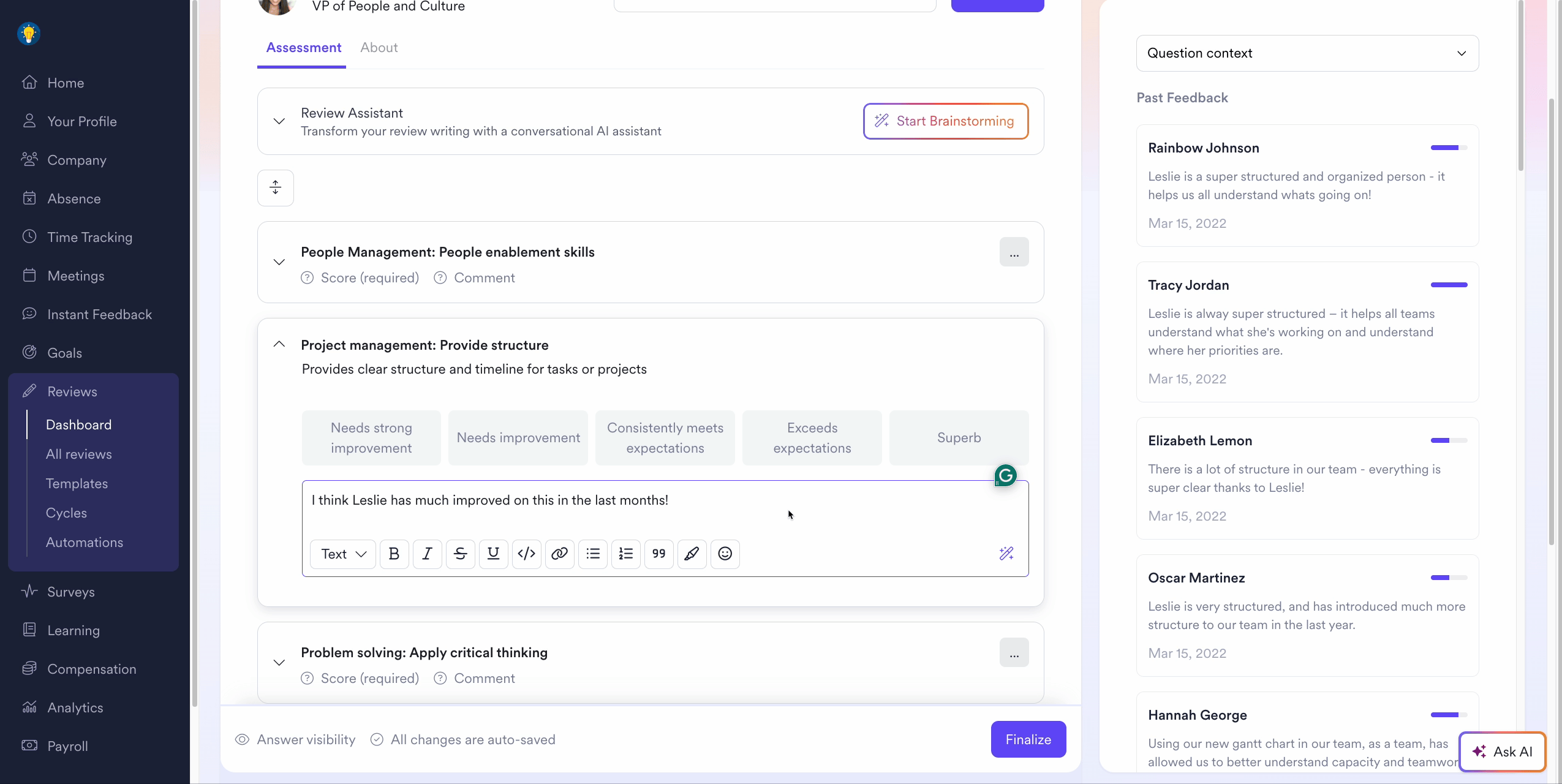 The Leapsome AI offers leaders an easy way to transform their thoughts into constructive comments enriched with ideas on improvement initiatives, giving their team members more impactful takeaways.