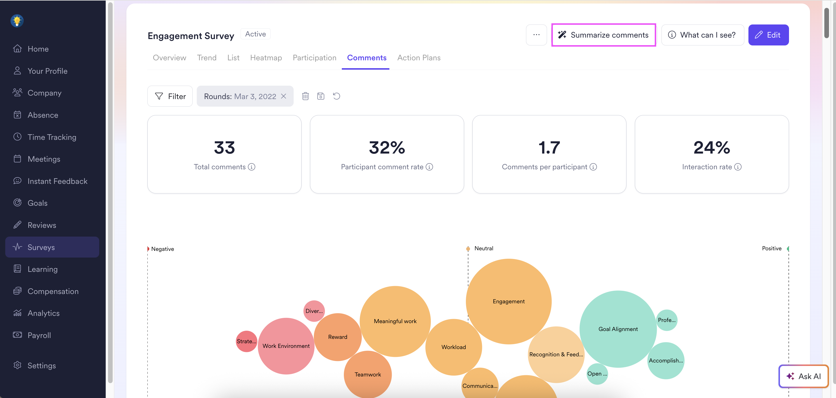 Oftentimes HR admins need to summarize key takeaways of engagement surveys. Yet breaking down the essence of a survey into key takeaways can be a daunting task. As a survey owner in Leapsome, you can do this with the click of a button. Leapsome’s AI functionality offers you an easy way to prepare a short AI-generated summary of all comments in a survey to share with leadership and key stakeholders to get a high-level sense of what people are feeling and talking about in a survey.