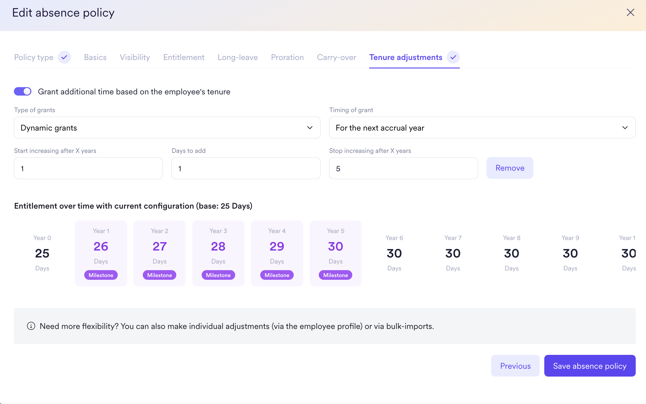 Companies may want to reward employees for their tenure in the company by providing them with more time off. For example, if the absence policy for a vacation policy has tenure adjustments, then any employee assigned to them with this policy will be considered for an increased number of vacation days when they meet the tenure requirements. Admins can set specifying rules to dictate how many additional days an employee receives based on the length of their employment for the company. Admins can add multiple rules to account for different lengths of time, which will automatically be calculated in an employee's account balance once they hit that tenure.