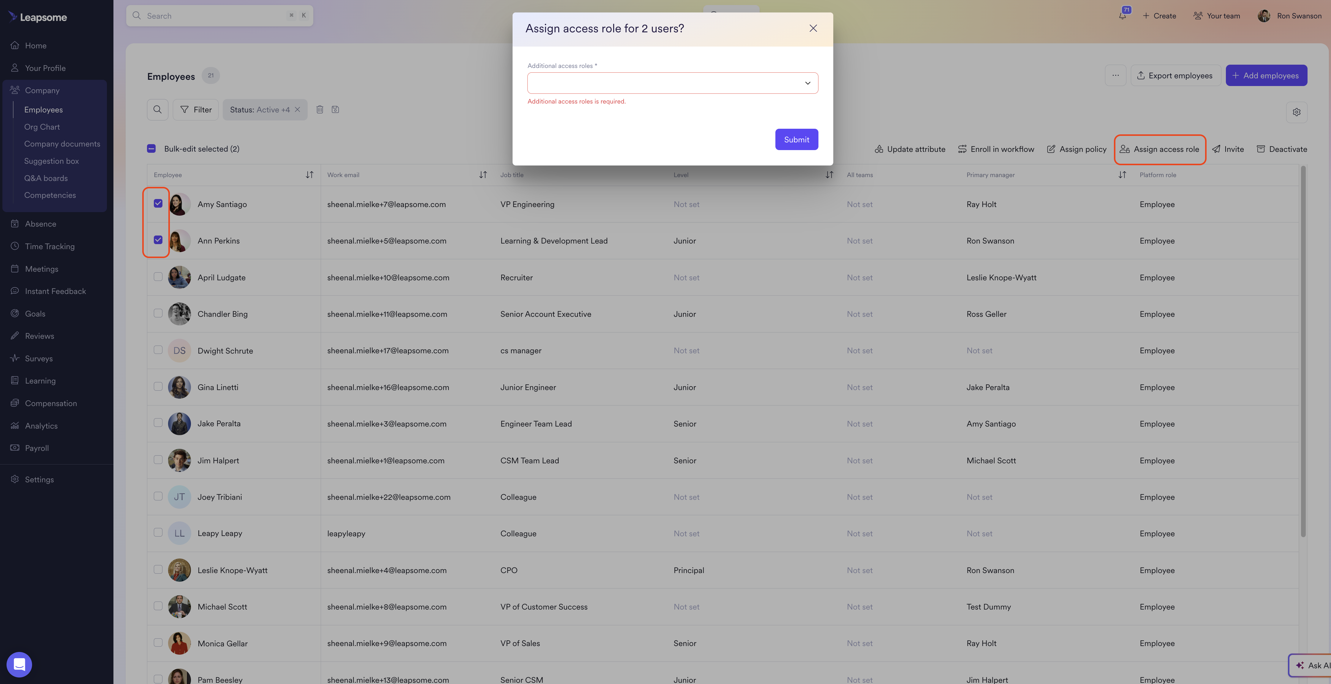 Navigate to Company > employees > select the relevant employees > Assign access roles > select specific role > submit.