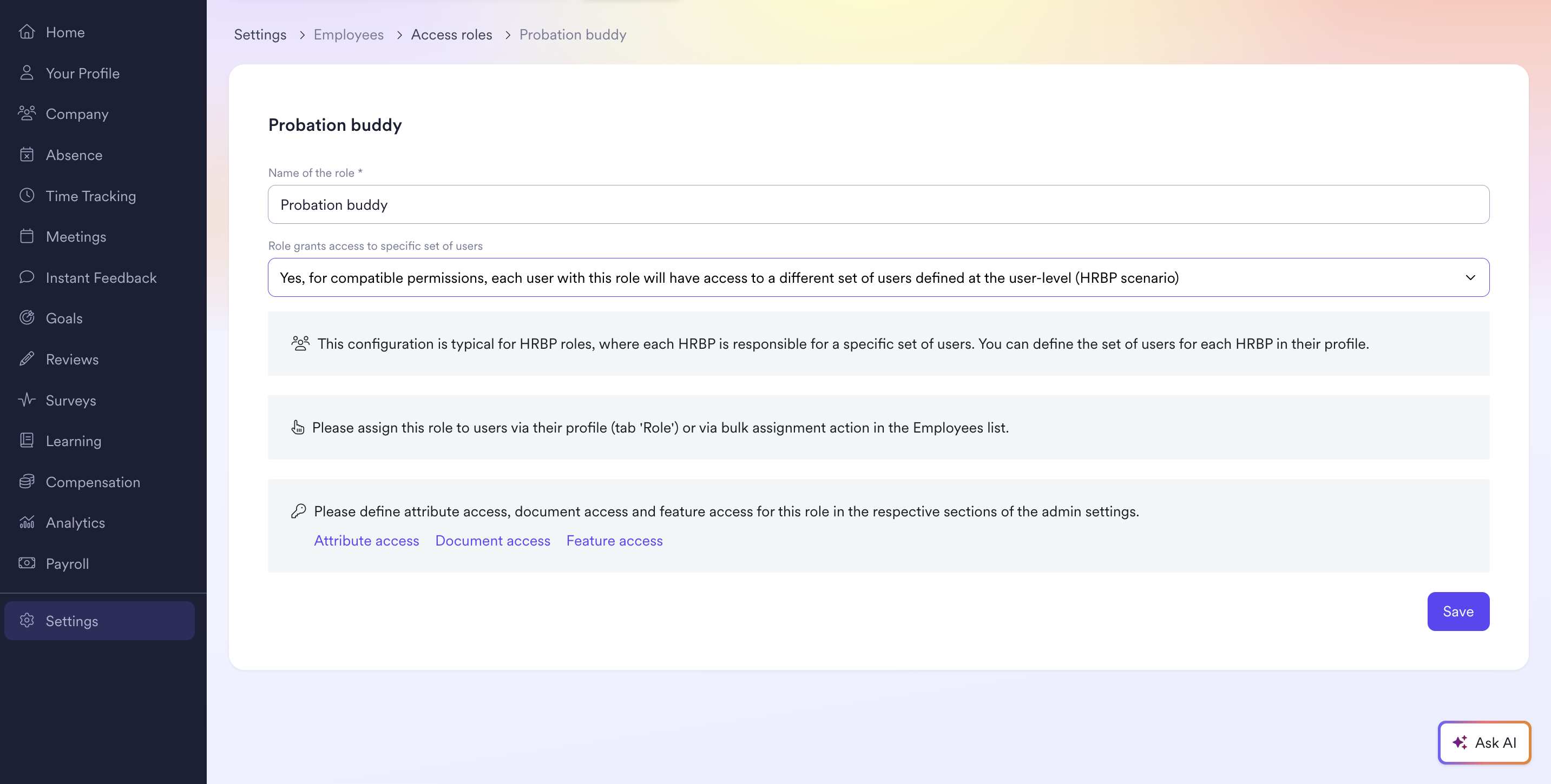 - Navigate to 'Settings' > 'Employees' > 'Access roles'